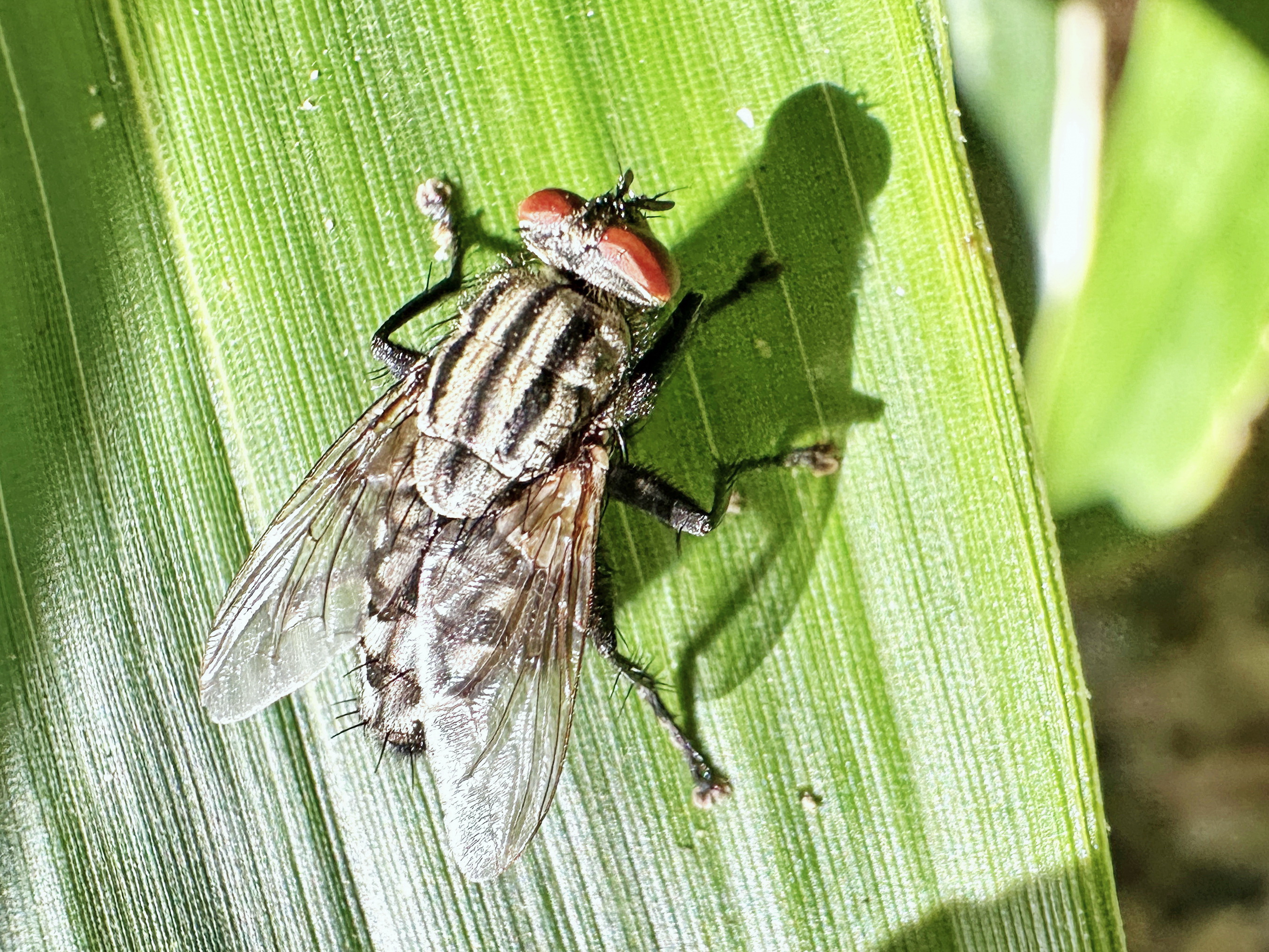 前胸背は灰白色に、3本の黒条が入り、小楯板に達します。複眼は赤くて大きい。腹部は市松模様。卵胎生で腹中で孵化して幼虫の形で生まれます。ニクバエはよく似た種が多く正確には交尾器での確認が必要だそうです。