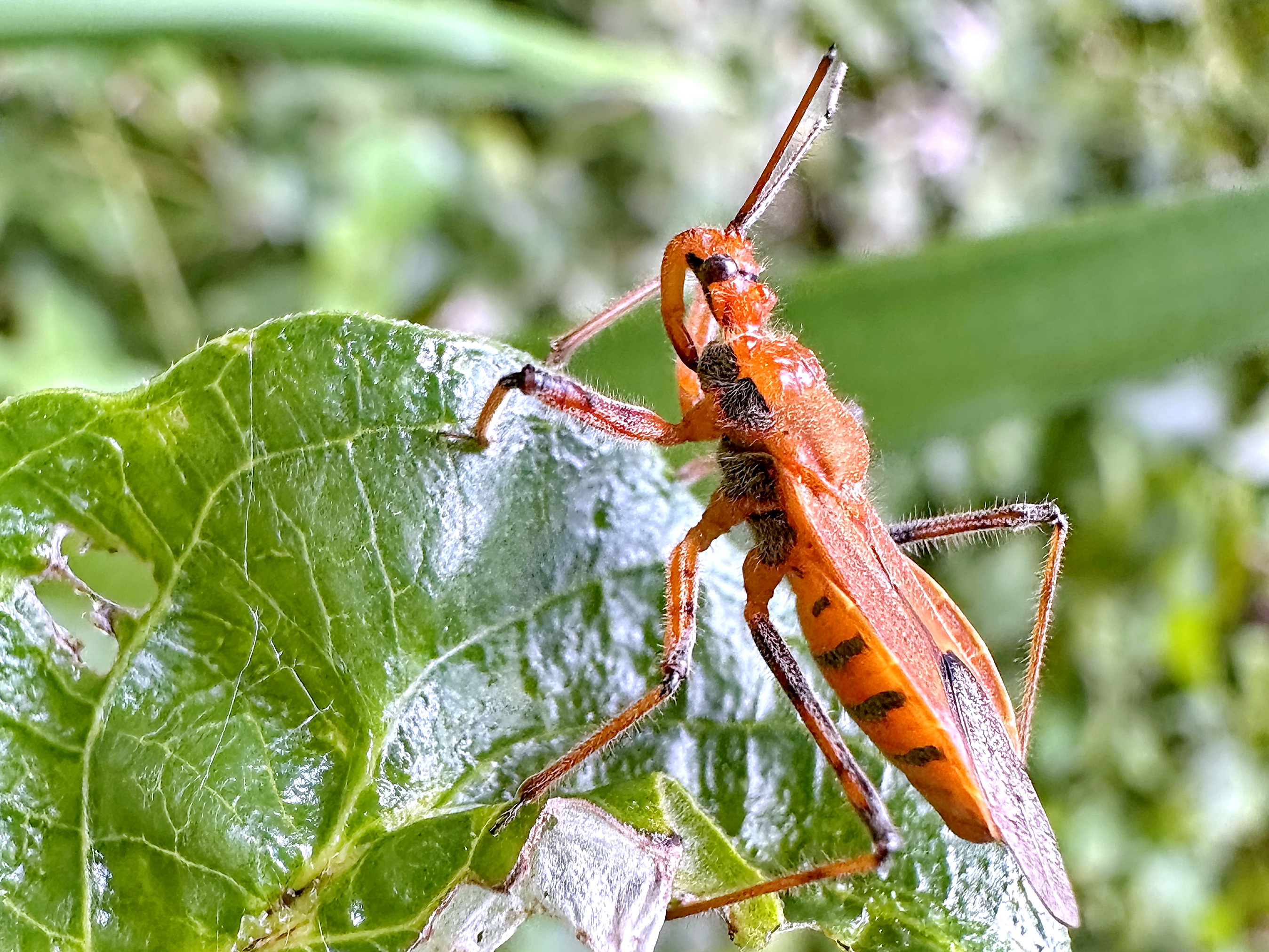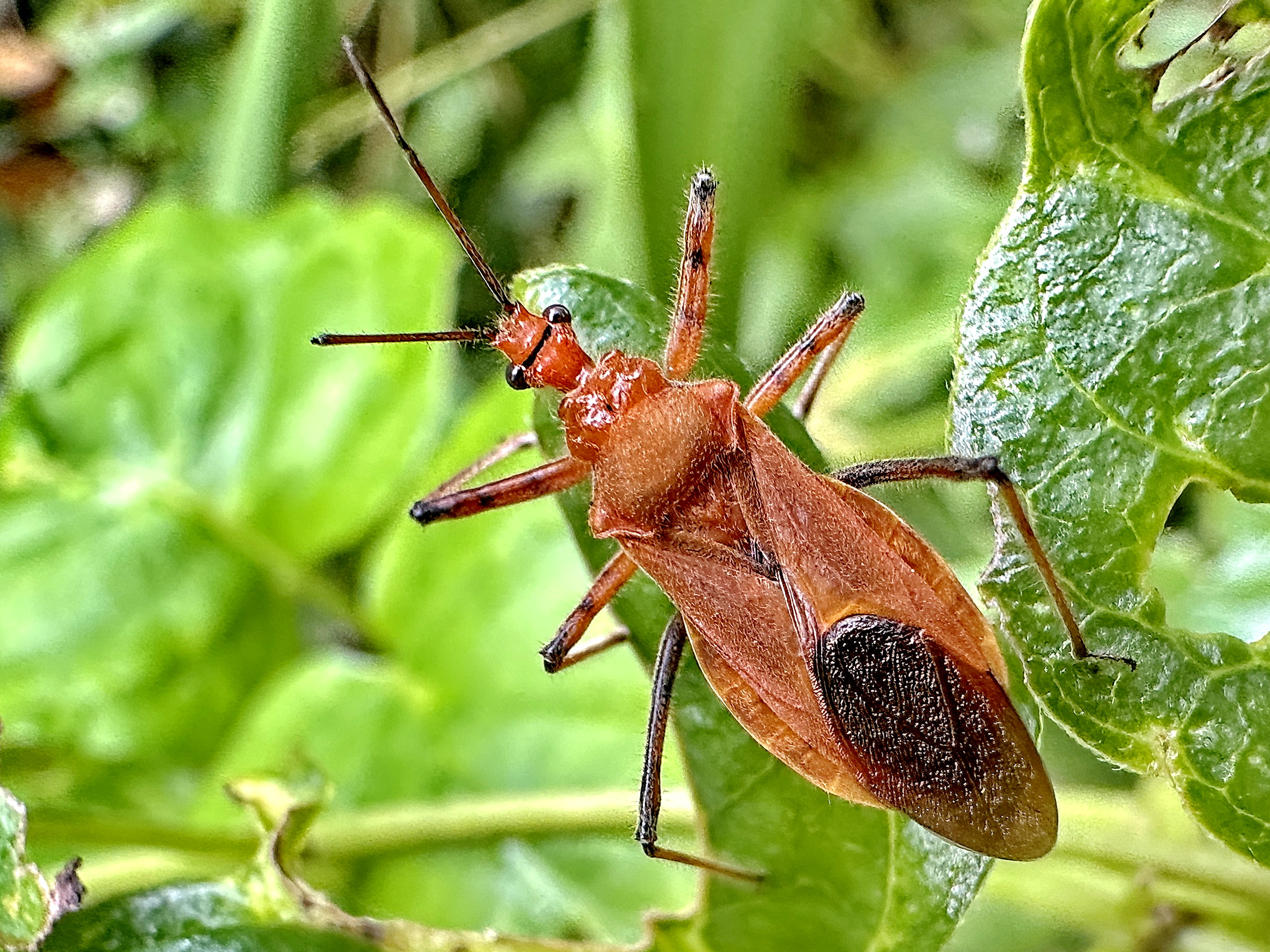 長く鋭い口吻を持ち、体液を吸います。アカサシガメ属は東南アジアで18種、国内では本種のみ。
