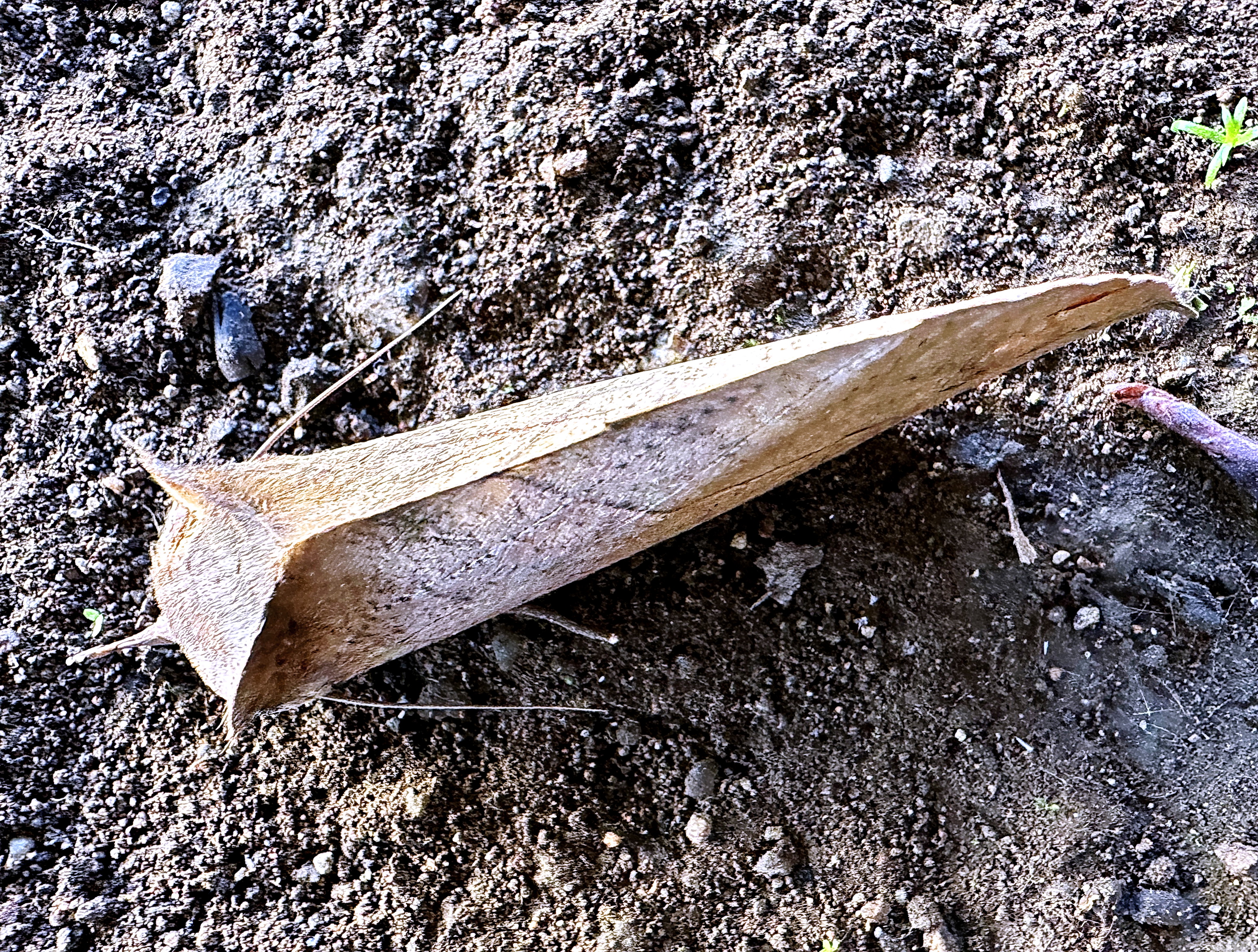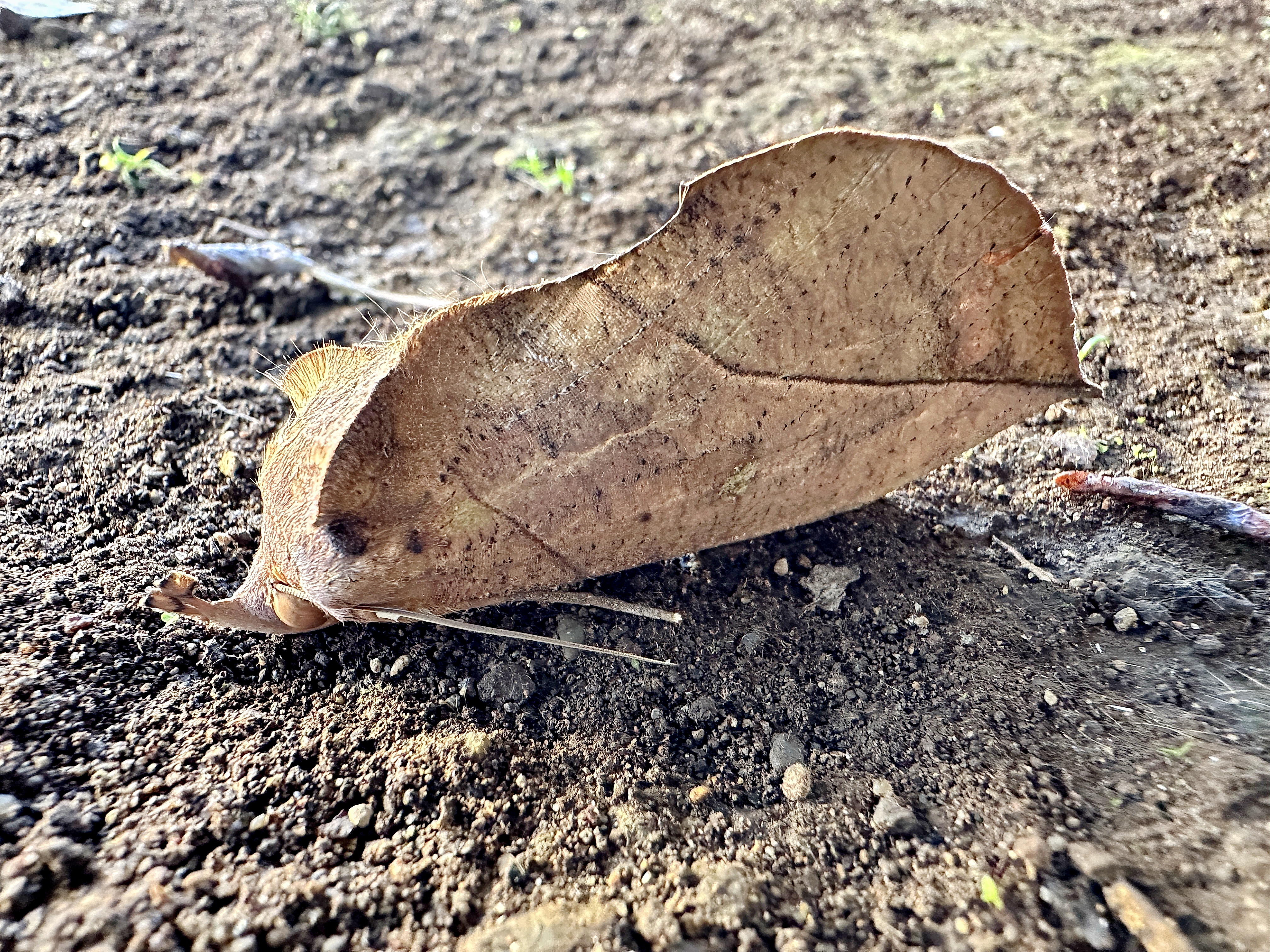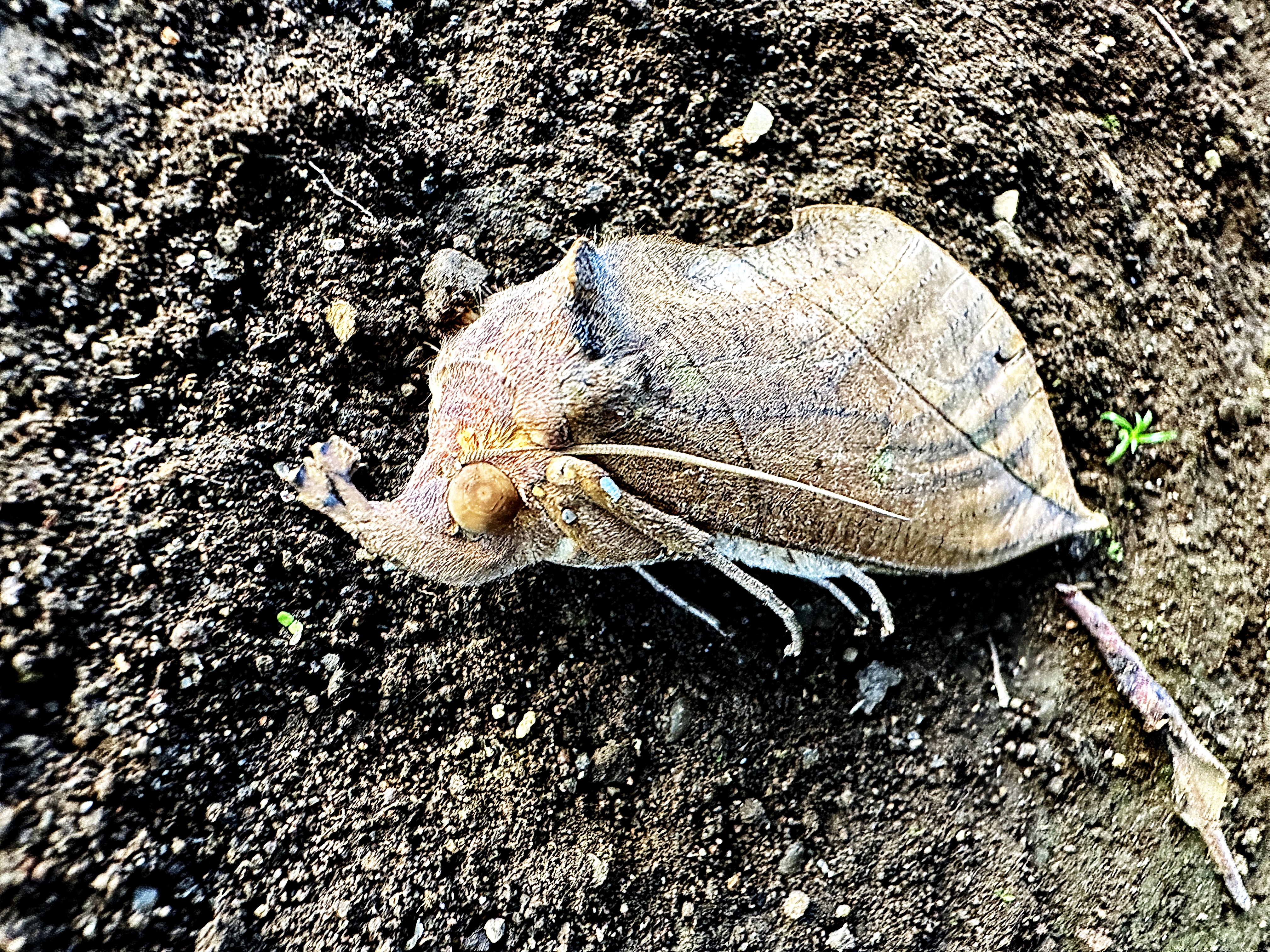 庭の枯葉を掃除していたら、オレンジ色がちらちら見える翅をバタバタさせて飛び出してきました。普通に止まっている状態ではまるで枯葉、葉脈まであります。前翅は茶褐色、頭部先端は葉柄の様な面白い形です。その付け根に触角があります。後翅は橙黄色に黒い線状紋と目玉のような斑紋があります。