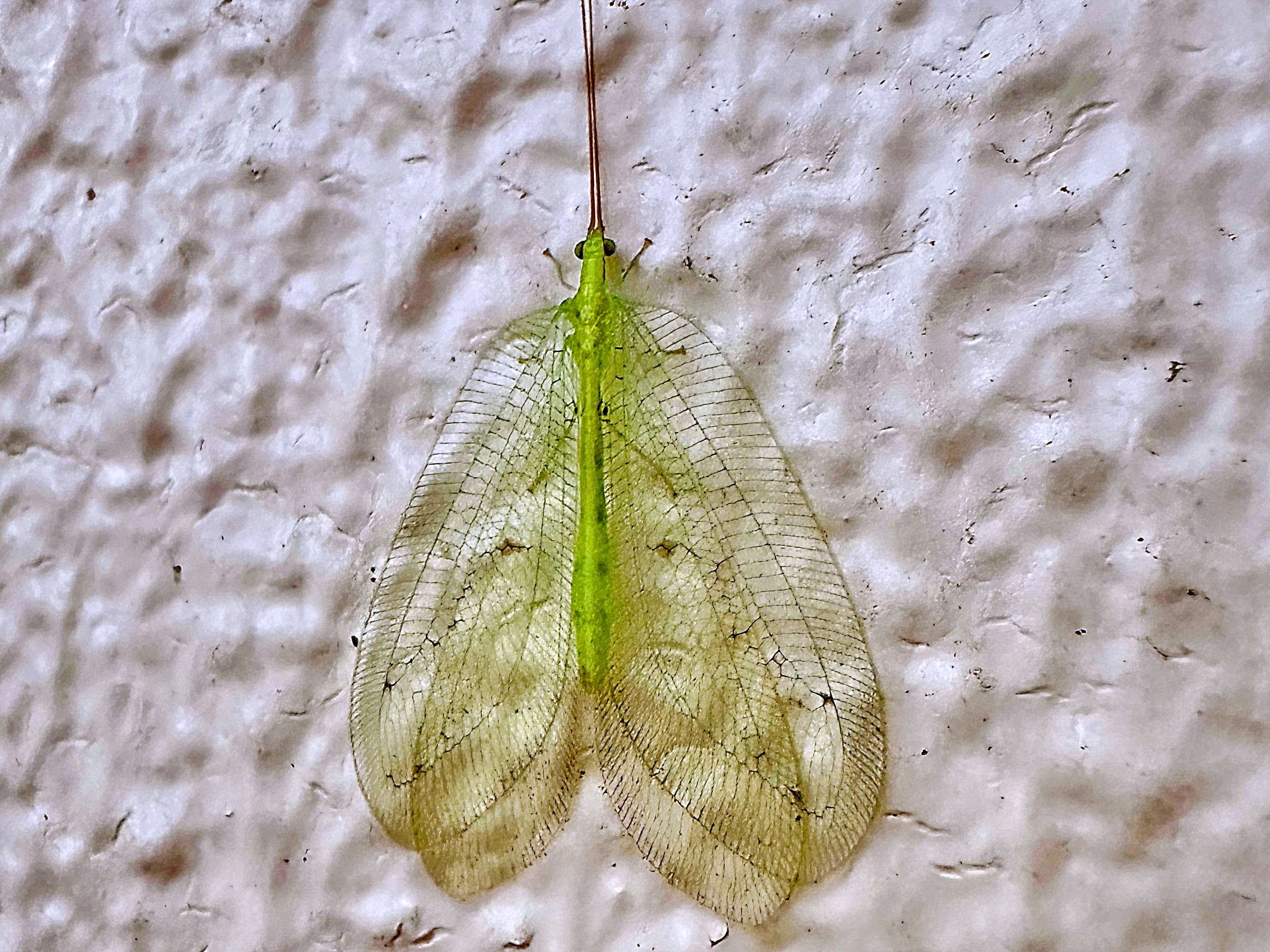 杭からひょろり触角のようなものが伸びていているのが見えました。裏側を見るとアミメカゲロウがへばり付いていました。この個体は黒点は不明瞭です。