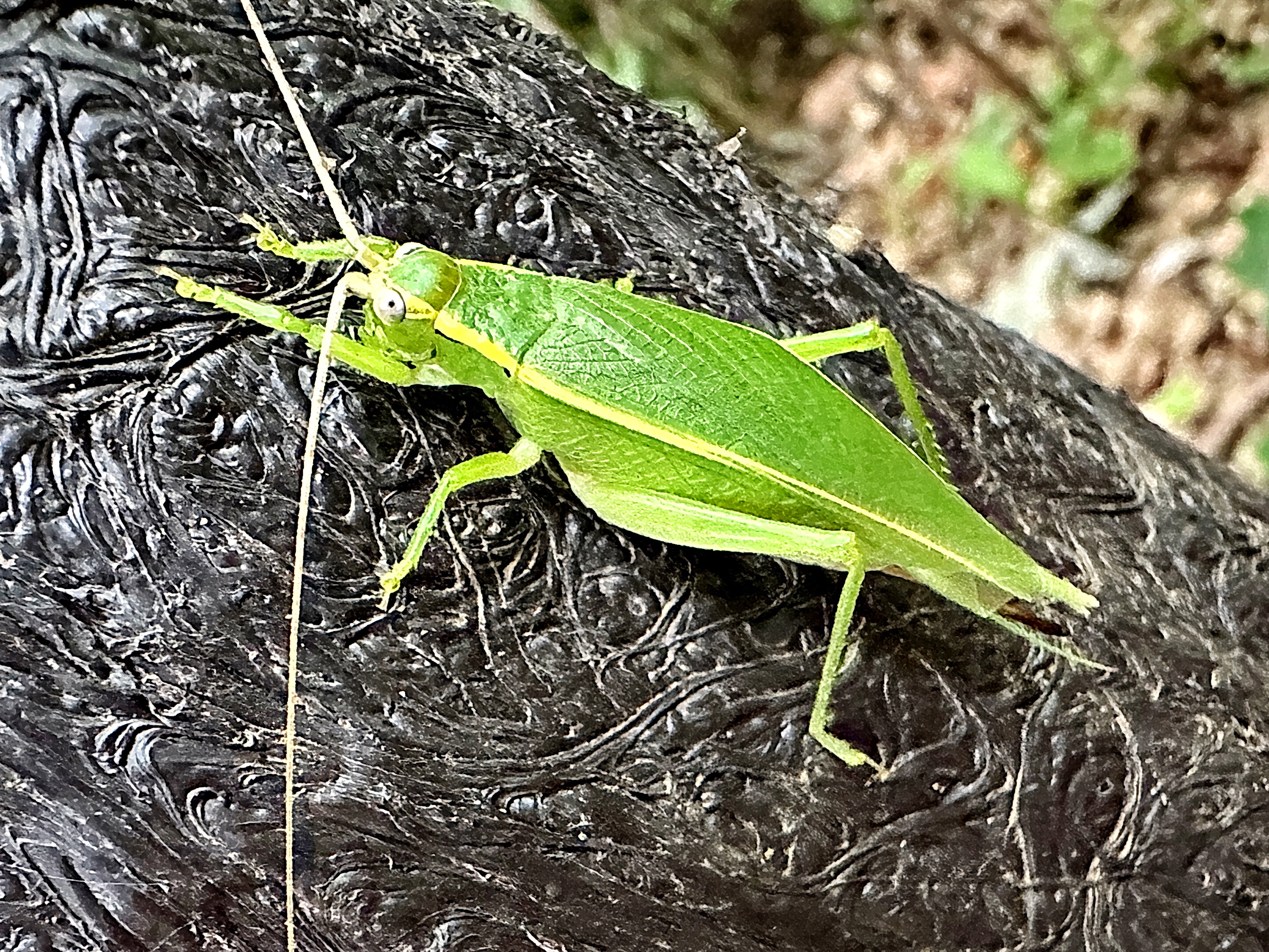 メスは奇麗な緑色、黄色いラインが入ります。頭部は小さく前胸背板は大きく後方に伸び、前翅、後翅とも長く、前縁は直角に曲がり腹部を箱型に覆っています。