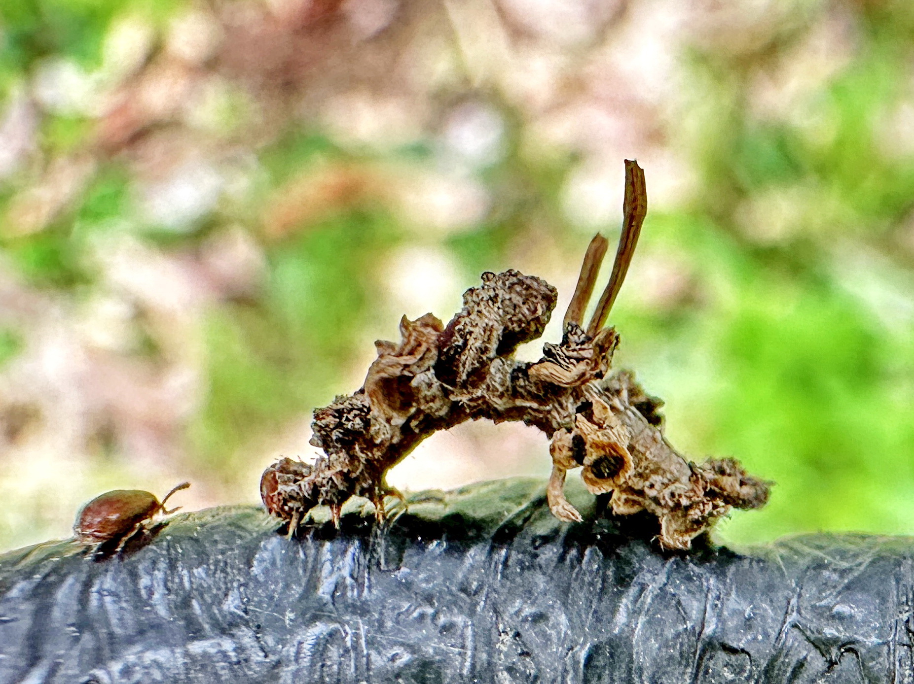 杭の上に何やら塊が、ゴミを背負うと言ったら最初に浮かぶのはクサカゲロウの幼虫、ですが、動きは尺取り虫です。