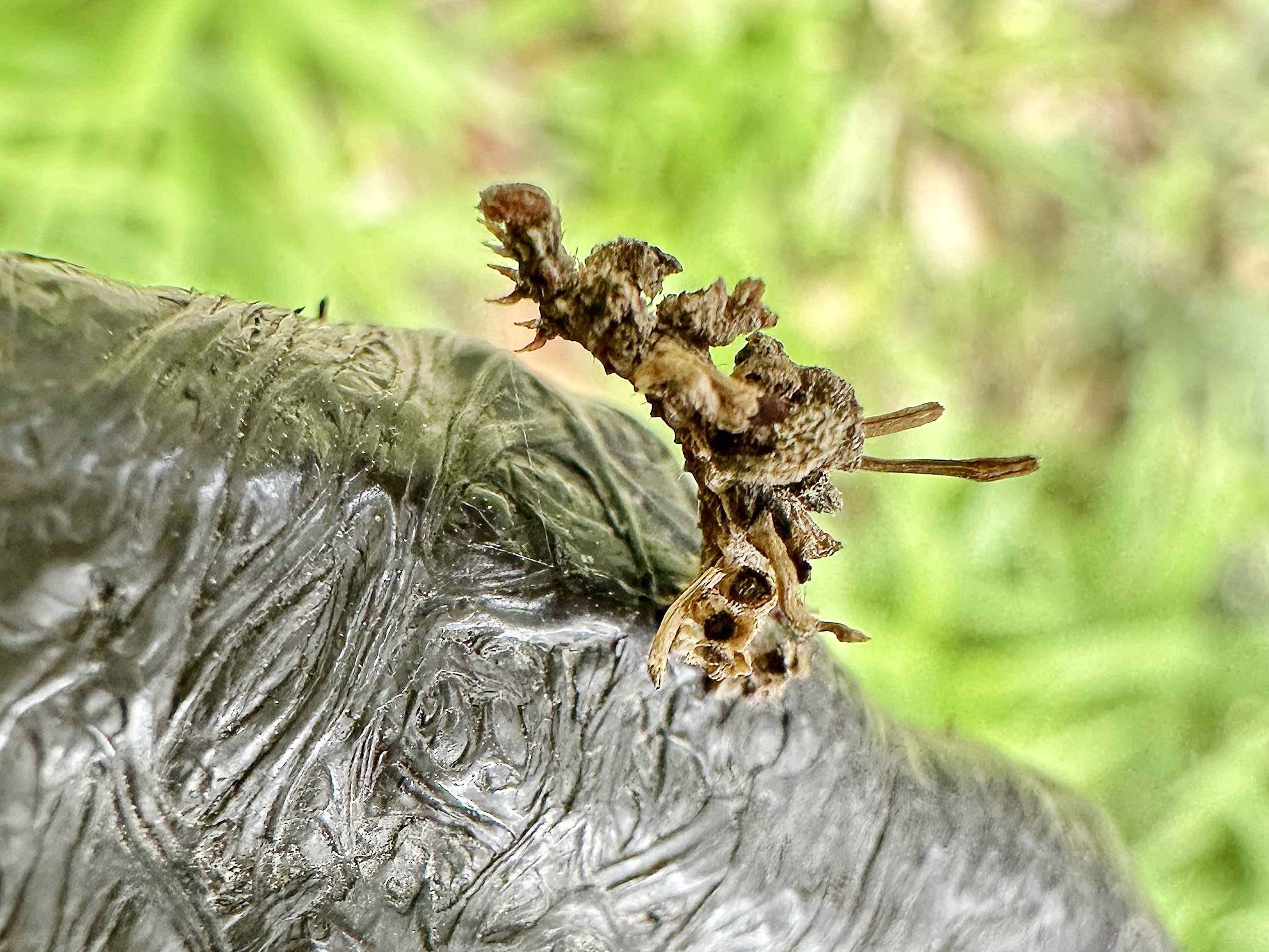 シャクガ科アオシャク亜科には枯葉屑などを張り付けて擬態する幼虫がいるそうです。詳しいことは分かりません。