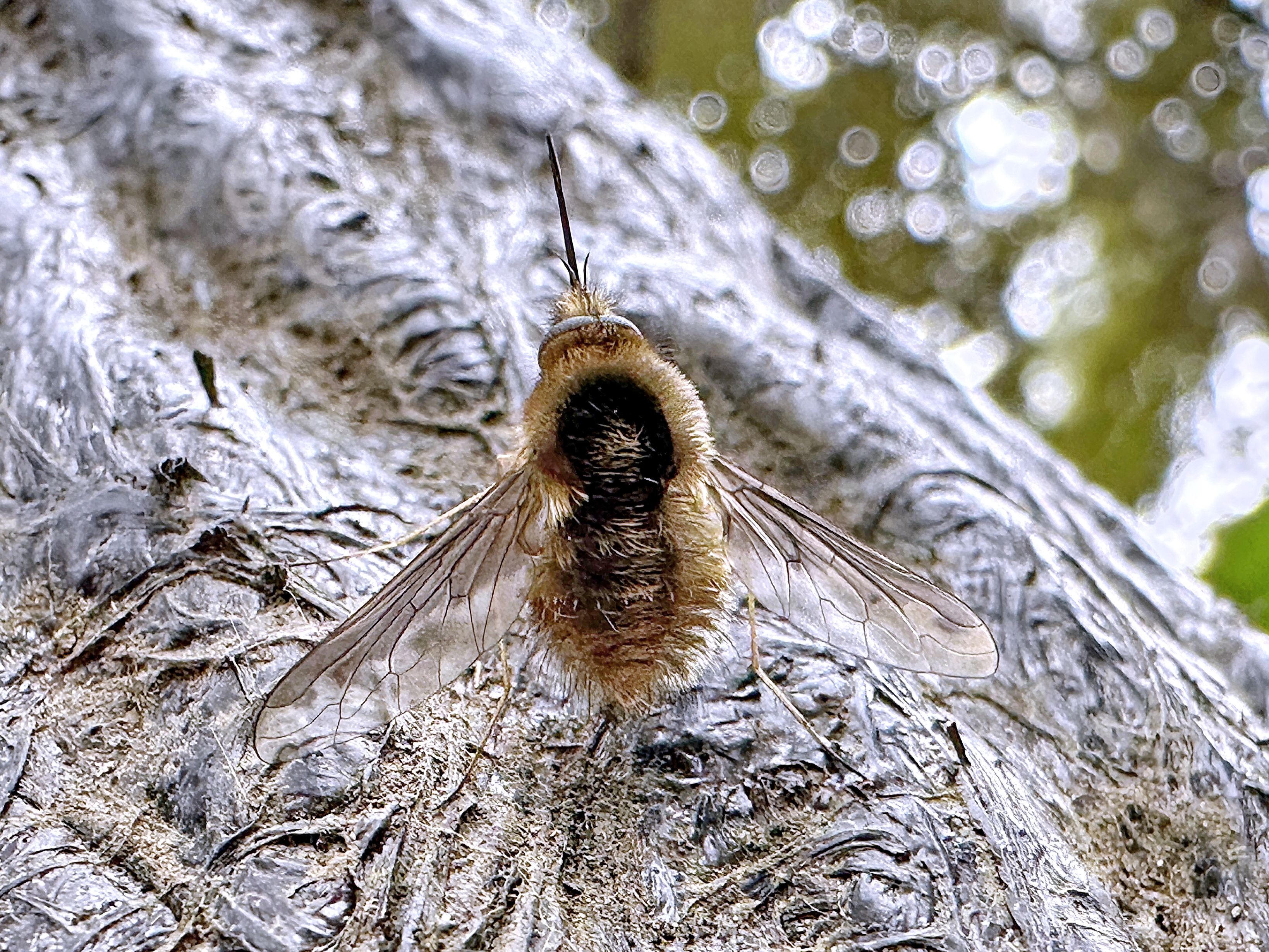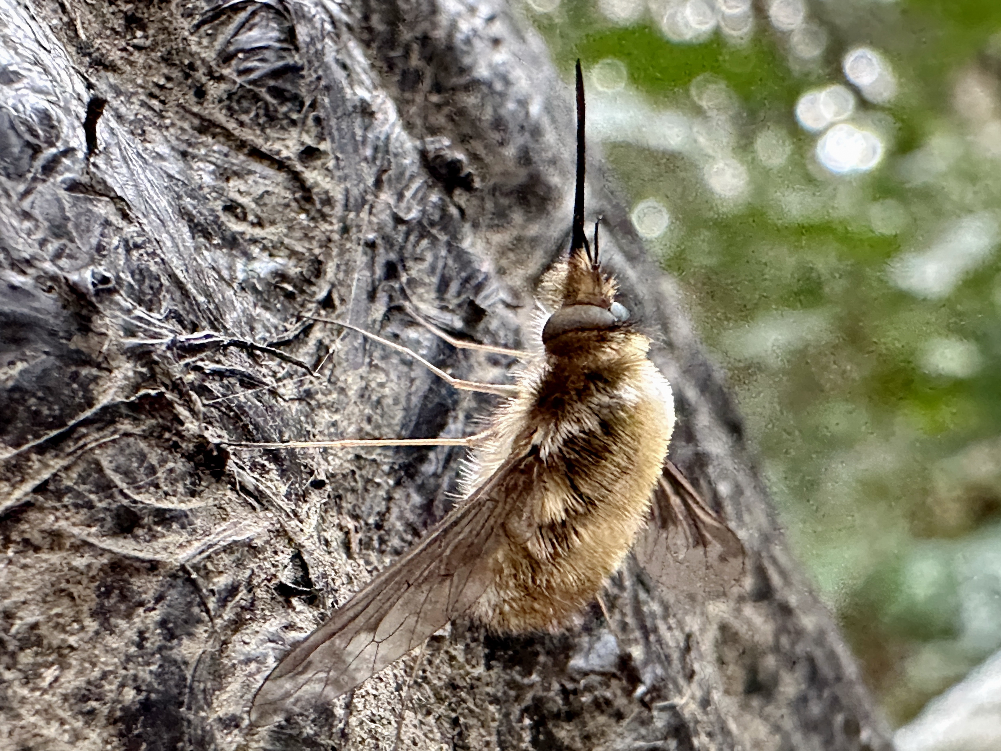 丸みの体に茶褐色の毛を纏い、先端が尖った黒く長い口吻を持つ虻です。
