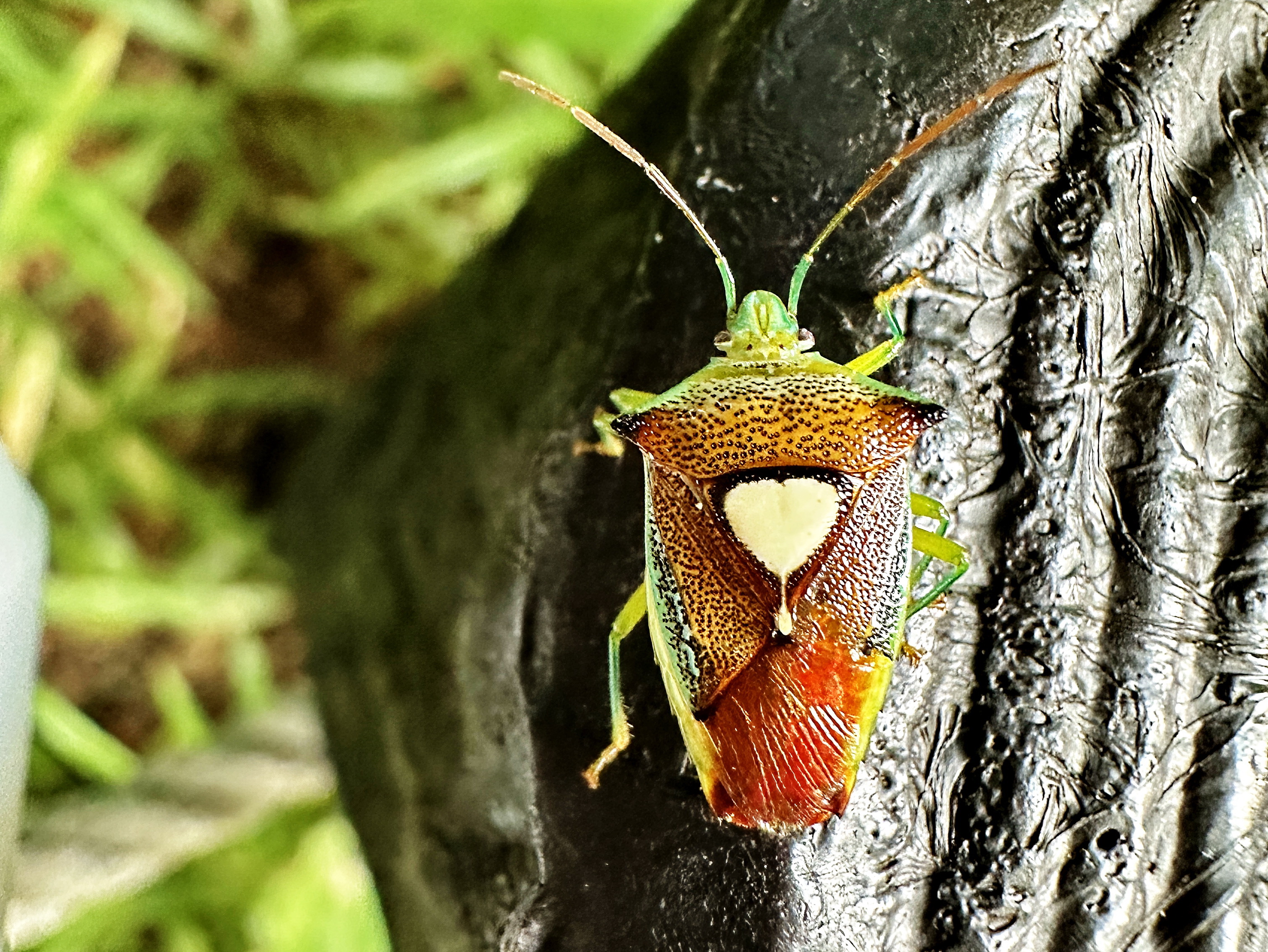 背中のハート模様が特徴のカメムシ、やっぱり見つけるとうれしくなります。臭いカメムシですけど。