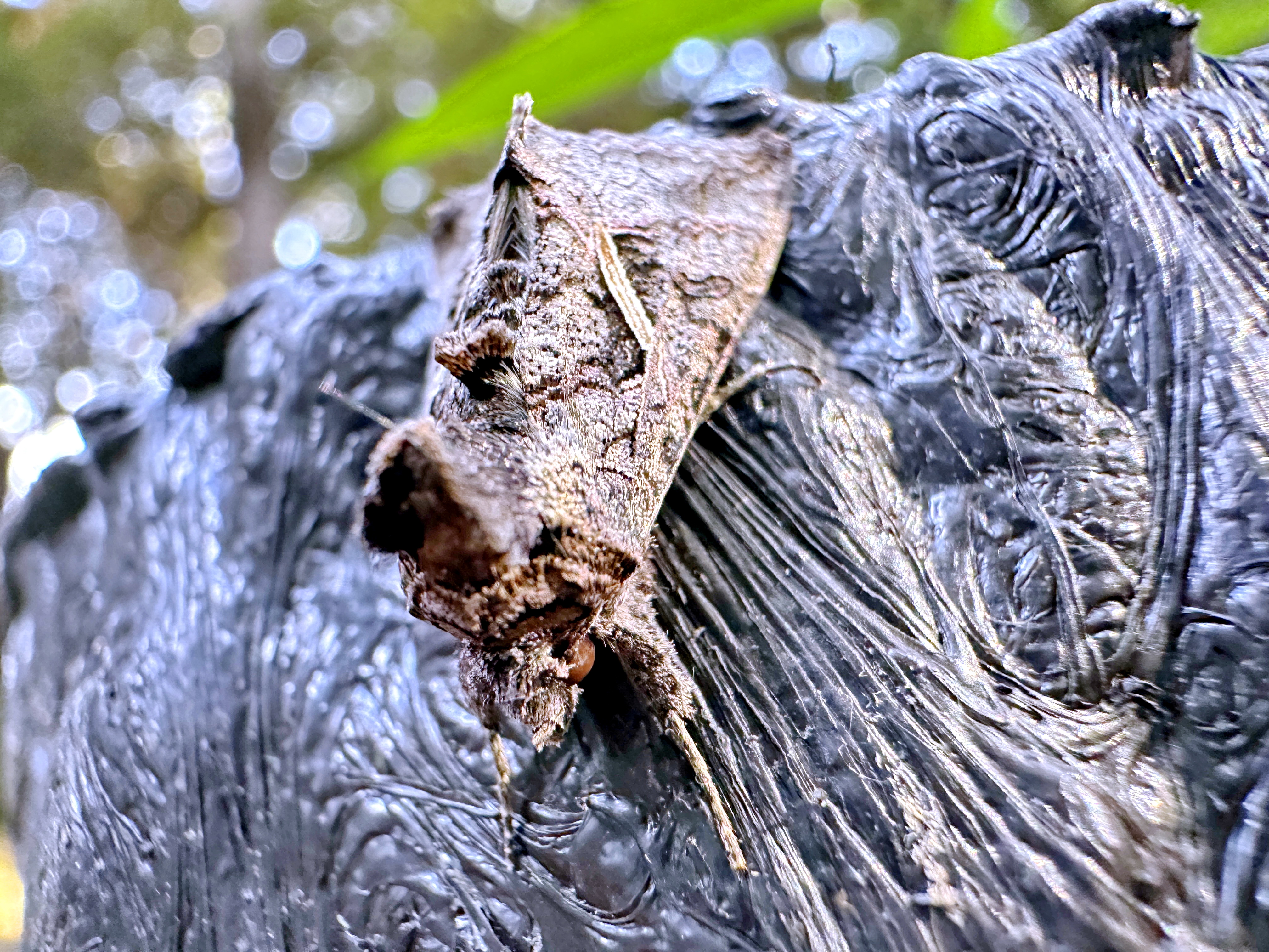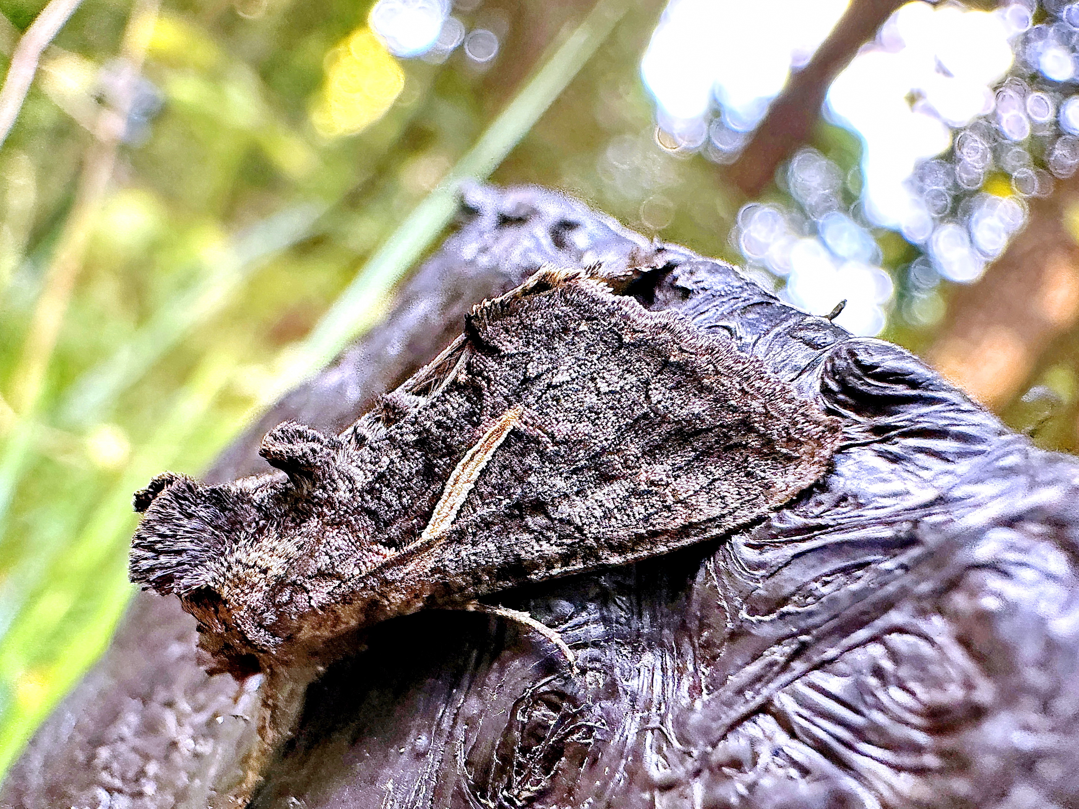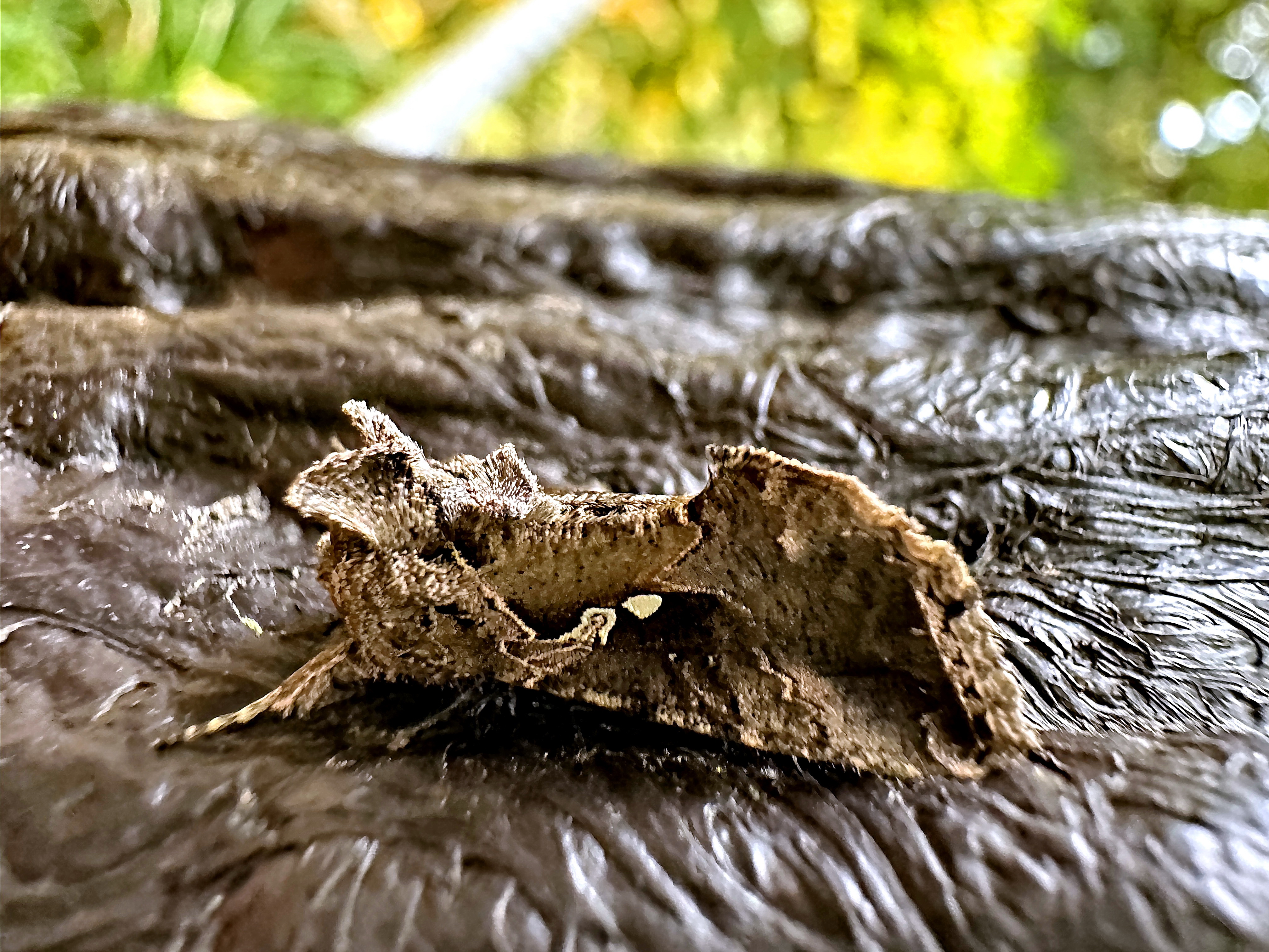 面白いフォルムをしています。前翅の中央に白状紋がありますが、個体差も大きく点状のものやないものもあるそうです。その傍には腎状紋があります。胸部の背中に2つの鶏冠のような毛の塊、腹部の背中にも1つの毛の塊があります。