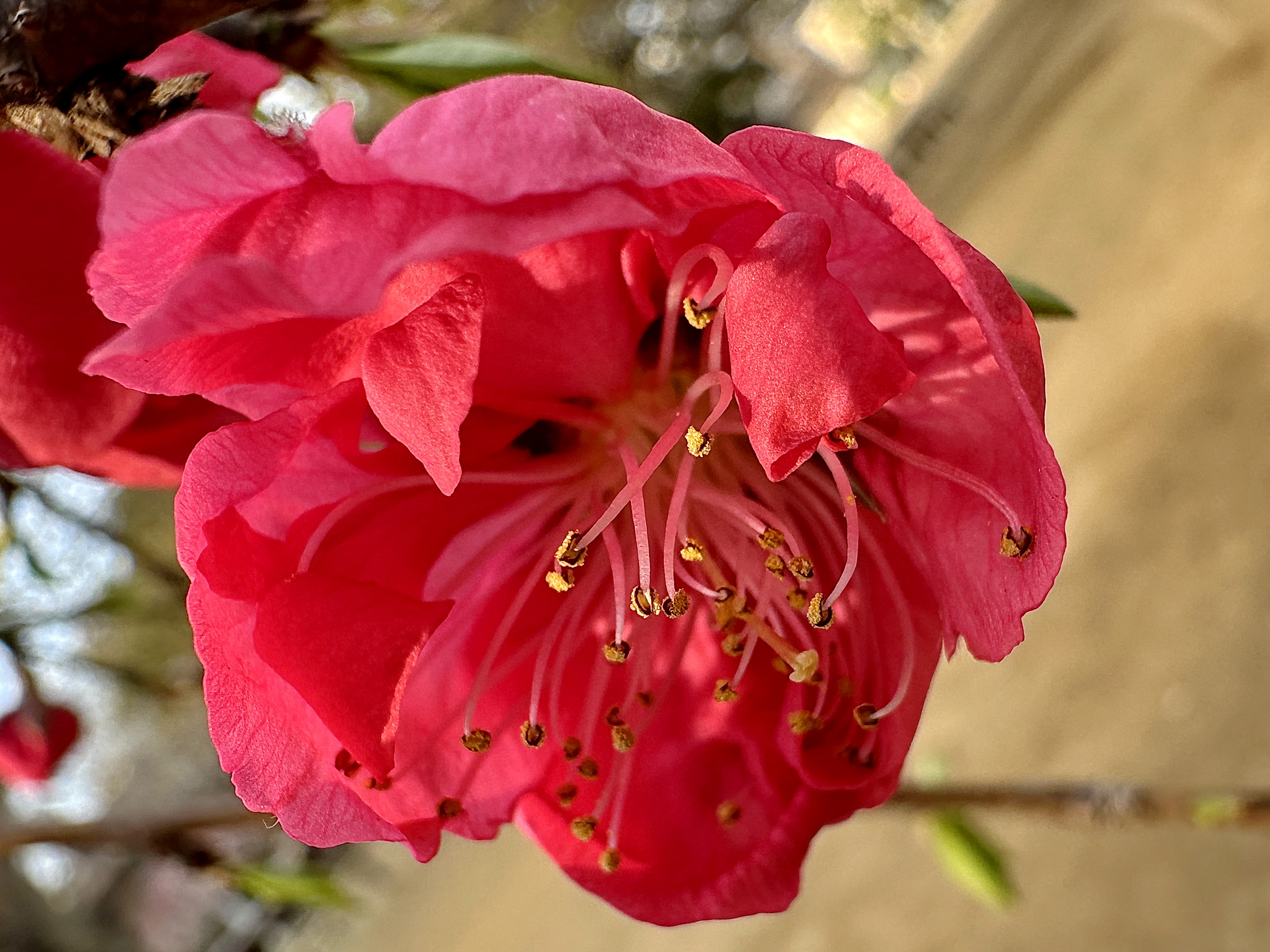 菊桃  花径4cm、菊のような細弁の濃いピンク色の花、省スペース向き。