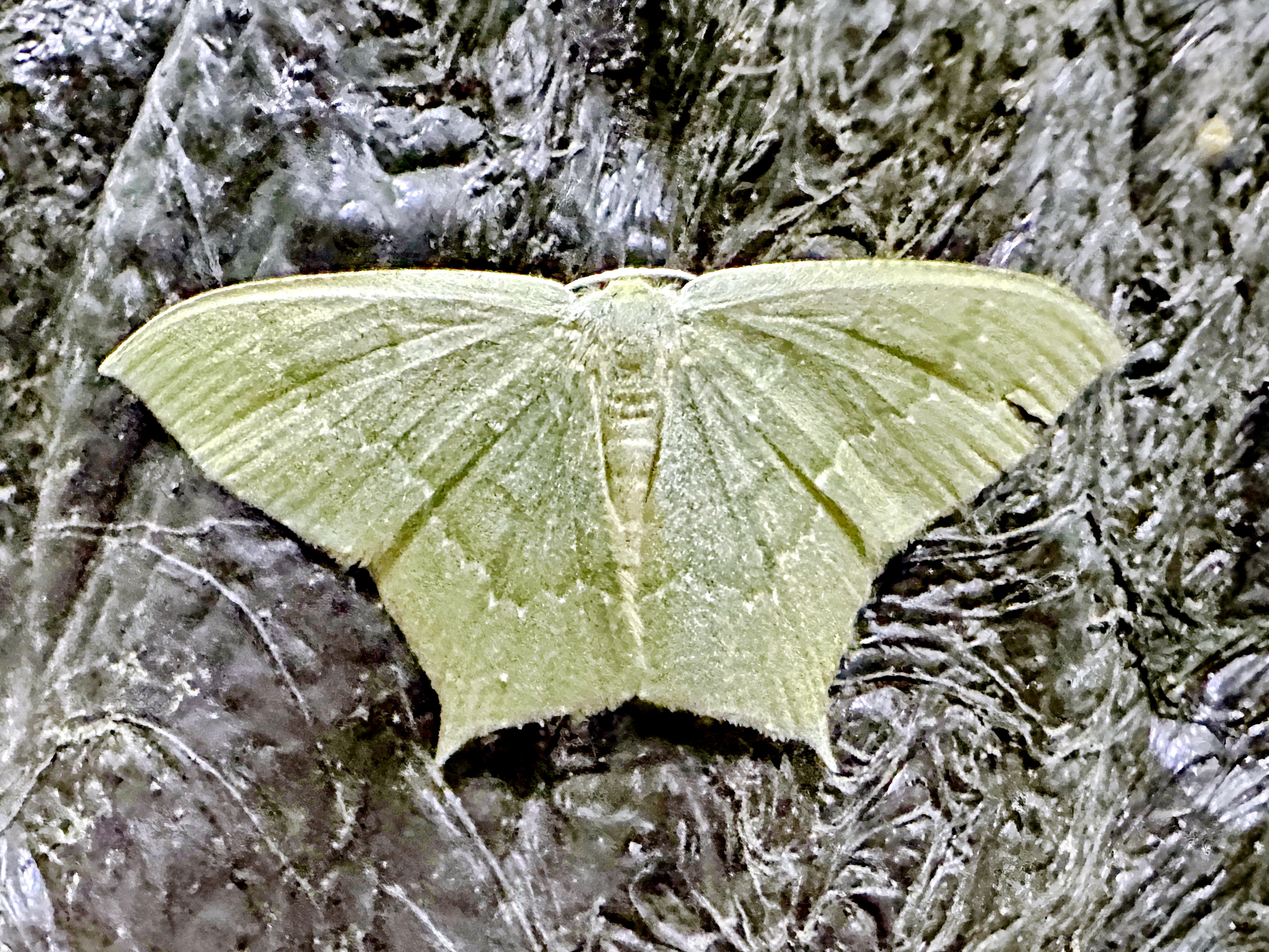 少し薄暗い葉の上に静かに翅を広げていました。翅色は淡青色、青緑色、内横線は浅い鋸歯状で不明瞭、外横線は強い鋸歯状、尾状突起が長いのが特徴。触角はオスは櫛歯状、メスは糸状。