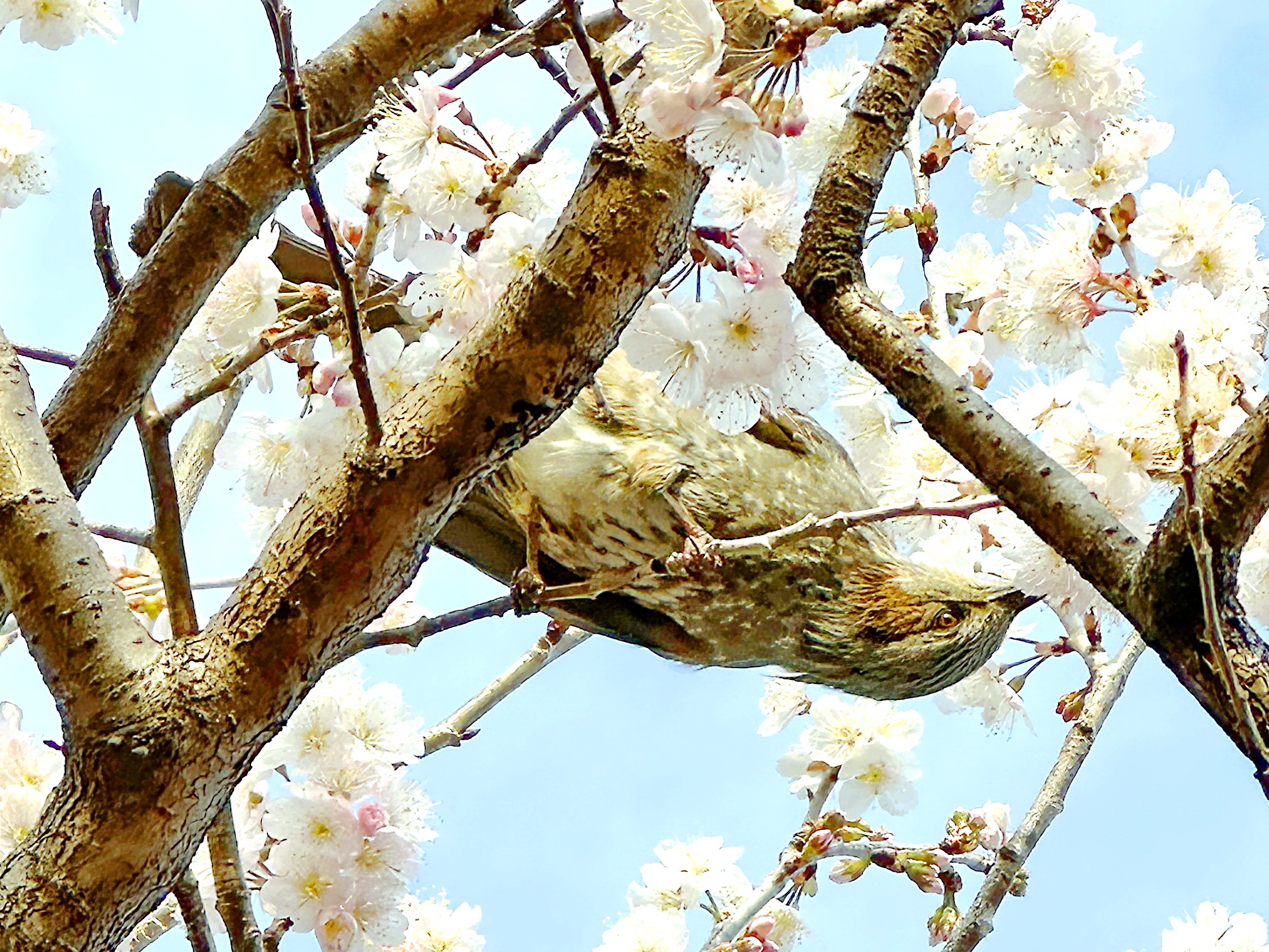 ヒヨドリは甘いものが大好き、サクラの花の蜜に夢中。花粉の媒介者です。サクランボの花にやって来たメジロなどを追い払う姿も目にします。果実も好きで庭のサクランボやヤマモモ、イチジク、ビワにもやって来ます。これはかなり迷惑です。網をかけても隙間から入り込んだり、上手に体重をかけて網の近くの果実を啄んでいきます。近所のキンカンをヤマモモの樹上で食べては下に食べかすと糞を落としていきます。種子の運び屋でナンテンやマンリョウなどの種子を落としていきます。赤い実は好きなようですね。繁殖期には昆虫なども食べます。