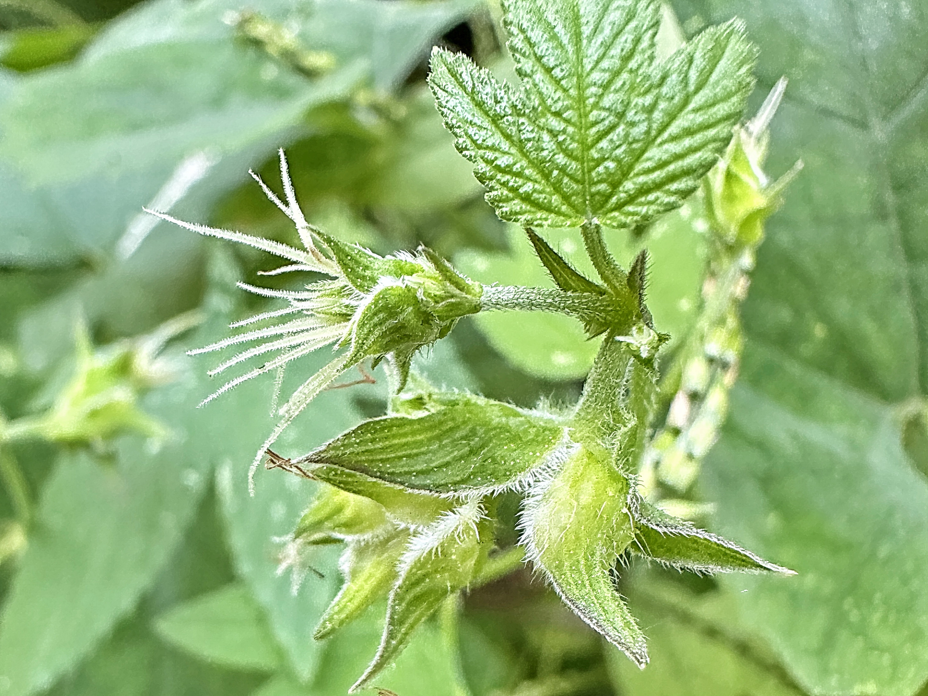 葉腋から花茎をのばして緑色の苞に包まれた3mmほどの雌花を下向きに数個、穂状に付けます。緑色の子房から2本の花柱を出します。