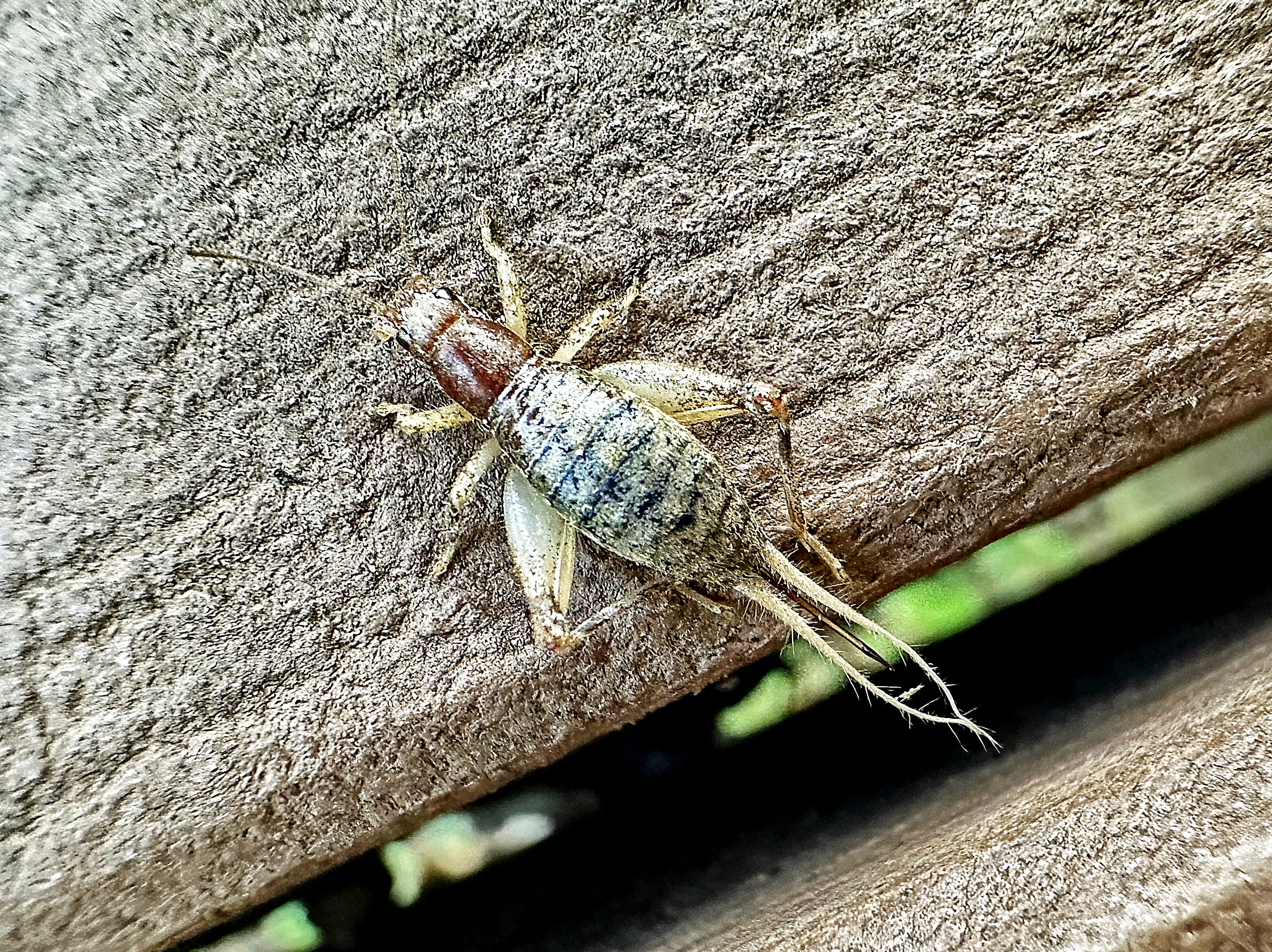 頭部は小さくやや細長く扁平な体形で、最初は灰白色の鱗片に覆われています。活動するうちに鱗粉が剝がれ地色が現れます。頭胸部は明るい赤褐色で前胸後縁に白帯があり、腹部は黒褐色で腹端には尾角があります。前翅は小さくうろこ状で暗赤色、後翅は欠きます。触角は長く、脚は短く淡褐色。最初は夜間、気温が下がってくると昼夜を問わず鳴きます。成熟してくると、樹上からあまり動かなくなり葉裏などの目立たない場所にいて、なかなか姿が見られなくなります。