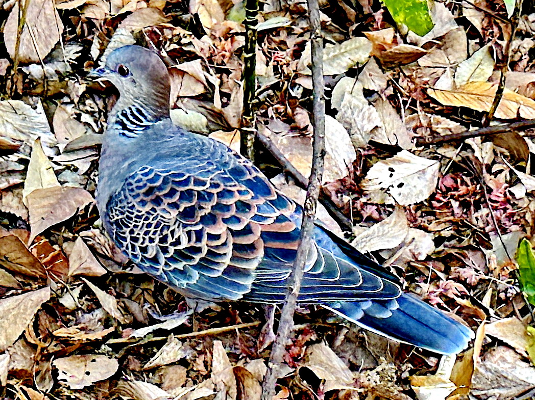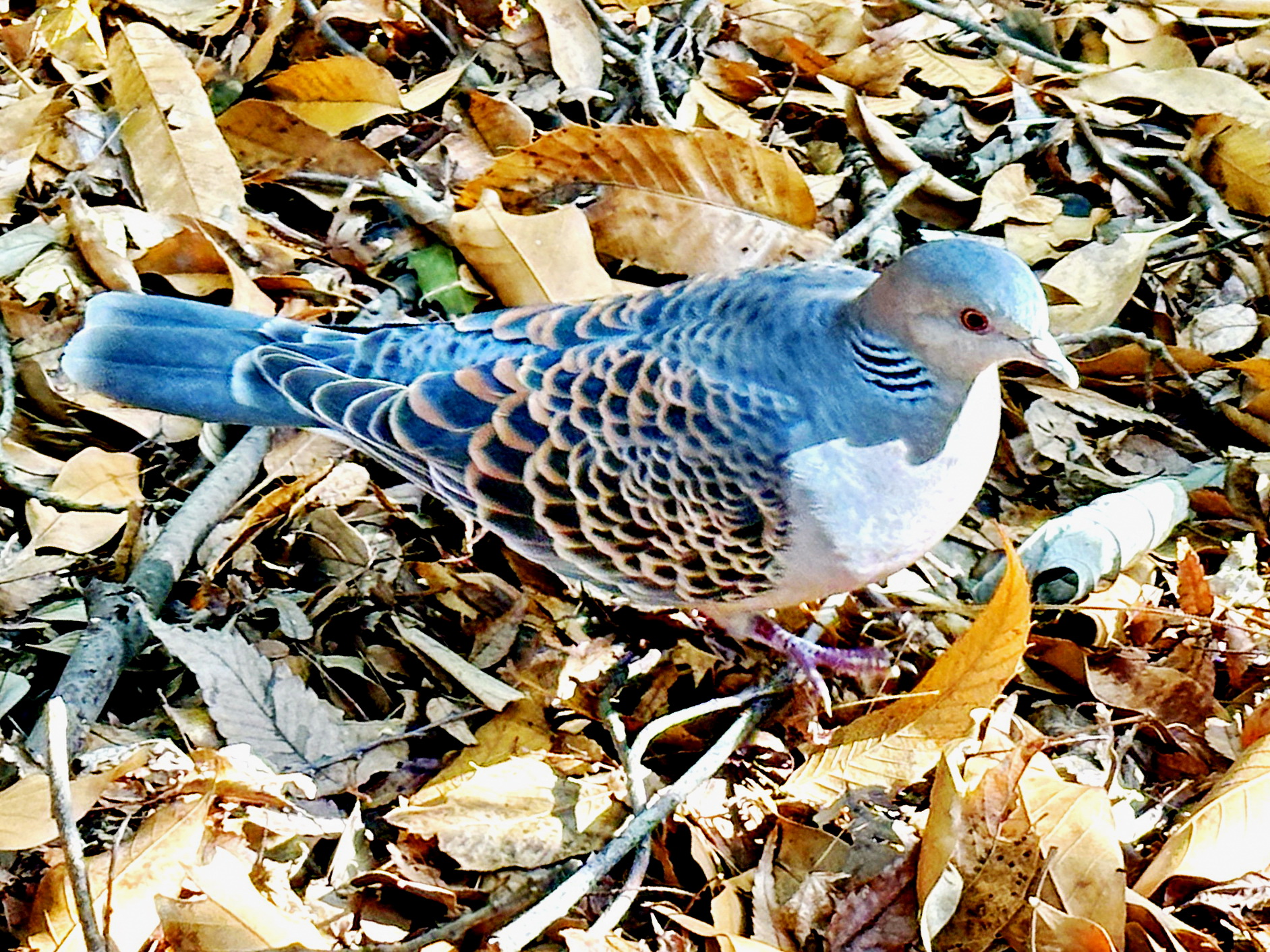 ゴソゴソと音がしたら・・夢中で地面を突っつくキジバトでした。かつては狩猟の対象だったキジバトも今や身近な愛らしい存在に、メーテルリンクの青い鳥のモデルはキジバトだそうです。