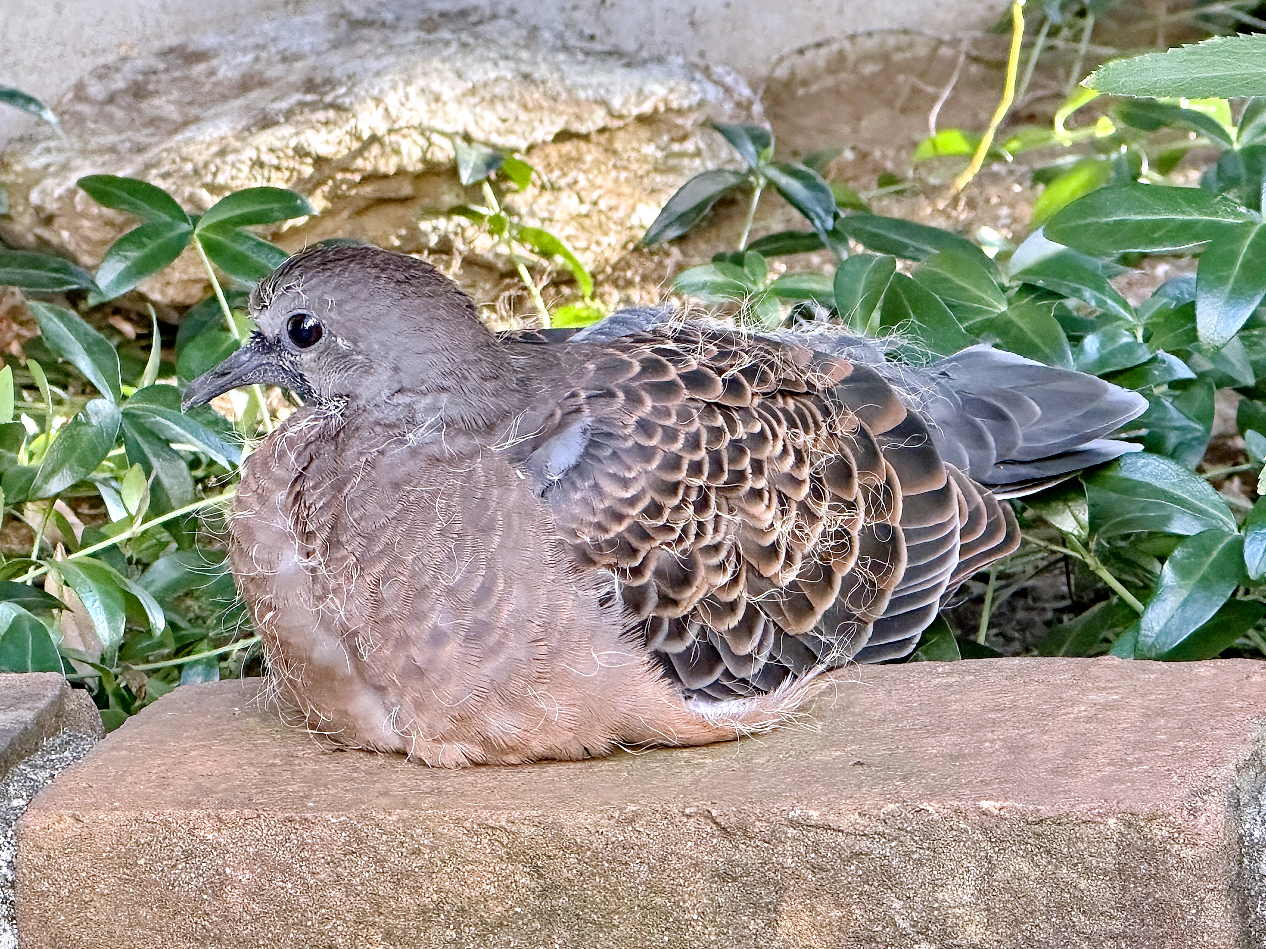 庭でバタバタしていたのは幼鳥でした。そしてレモンの木の下で暫く休んでいました。親鳥の姿は見られません。まだふわふわとした毛が残っています。幼鳥は頸部側面の濃青色と白色の縞模様がはっきりとしません。アイリングも黒色です。