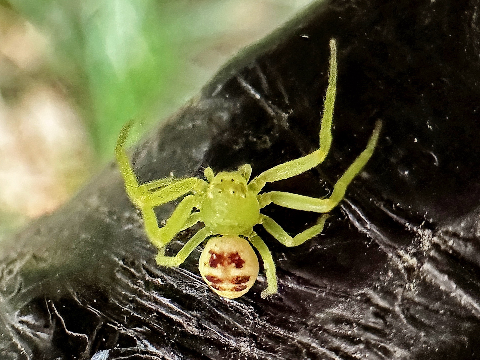 頭部、脚は緑色、腹部は丸く黄白色、褐色の斑紋があります。眼は8個、2列に並んでいます。脚は第1、2脚が長く。葉や花の上で脚を大きく開いて獲物を待ち伏せます。