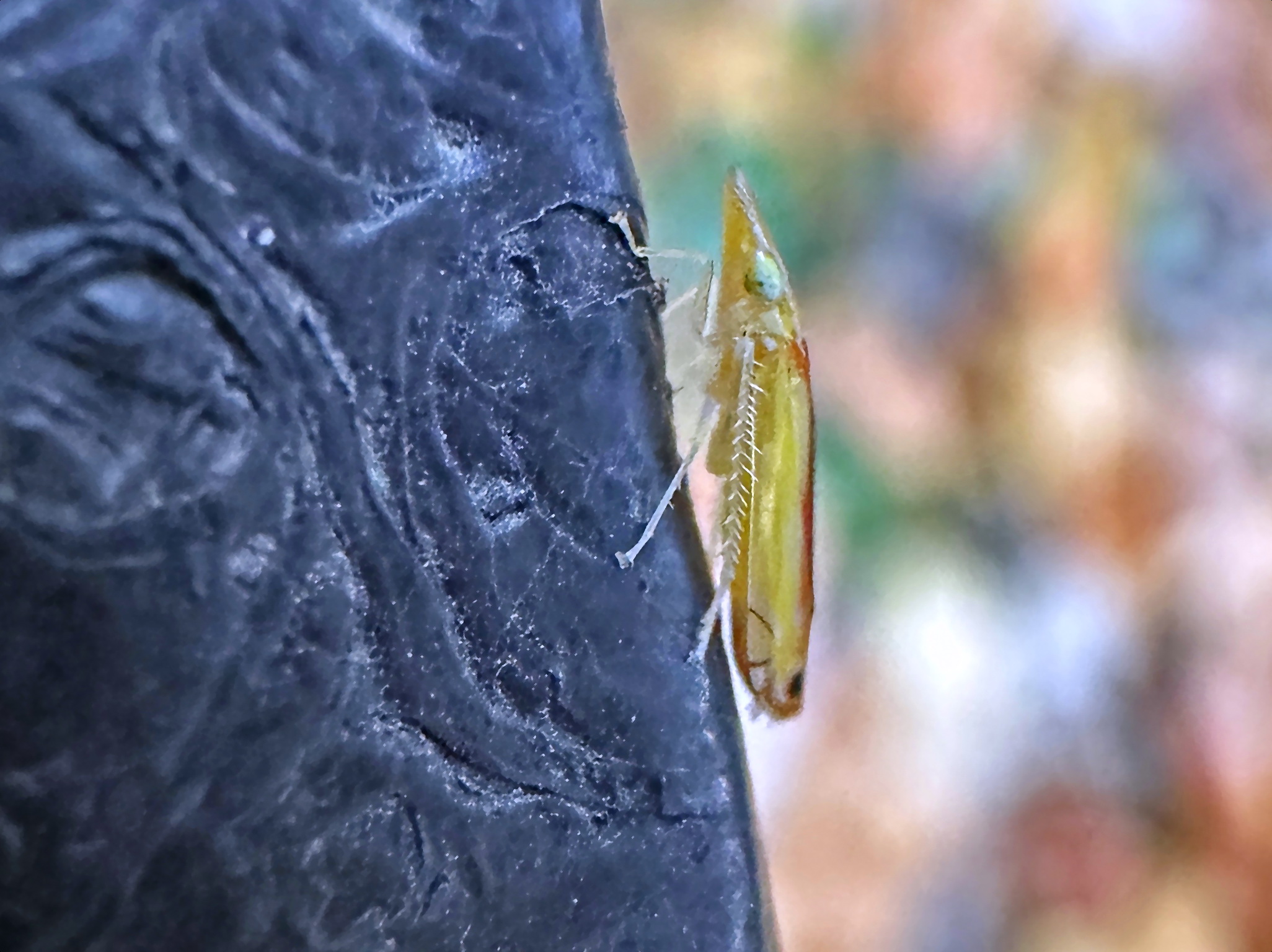 最初見たときは黒い点が目に見えました。それでマエムキダマシ。頭部が尖ってスプーンのように見えることからホソサジの名が付いています。黄色い体色に背中に暗褐色から黒色の縦条、メスは赤く縁どられて、鮮やかです。翅の先端には1対の黒点、左右に2対の暗褐色の条が入り、前脚と中脚に似せています。脚は淡黄色。
