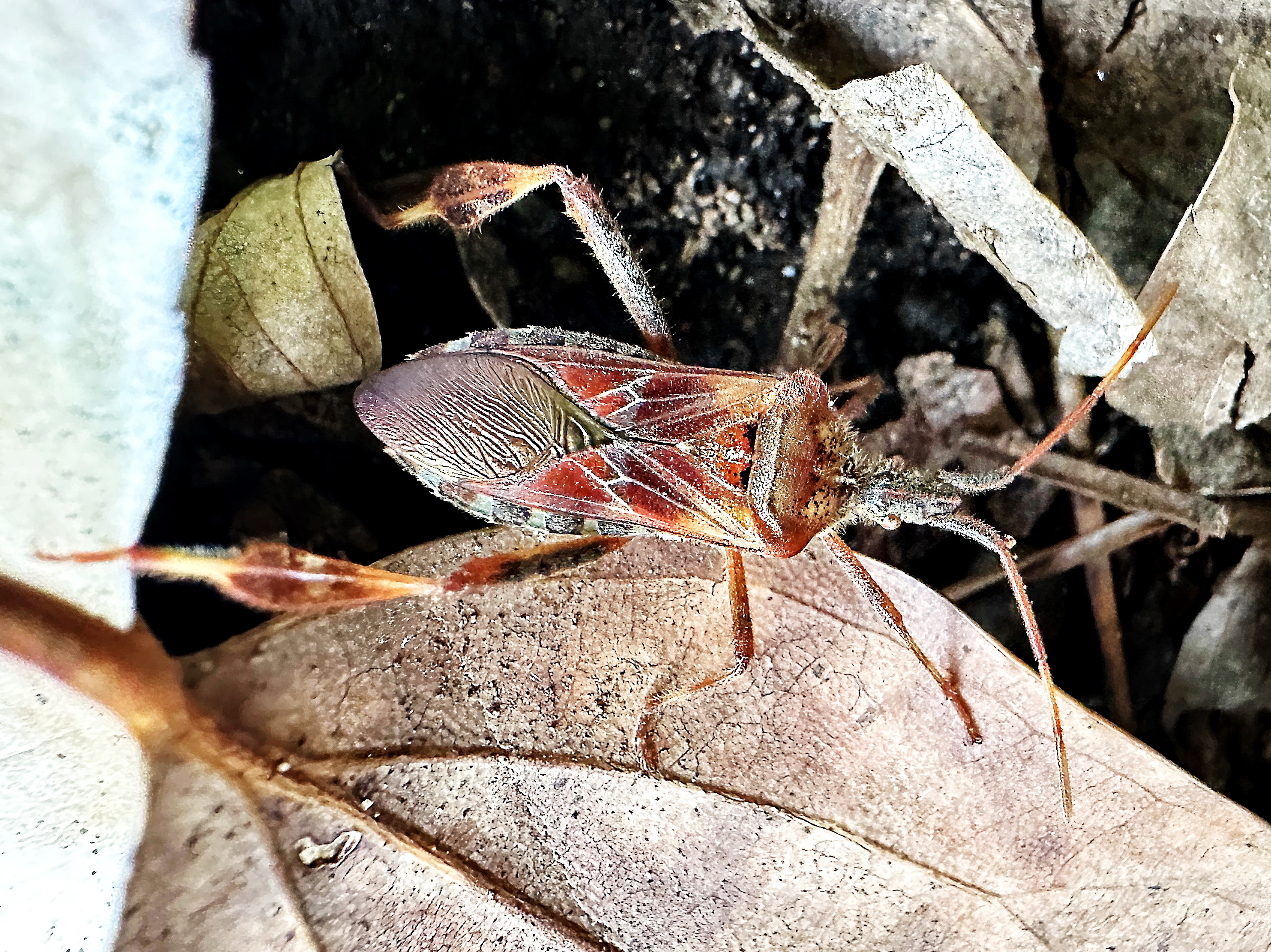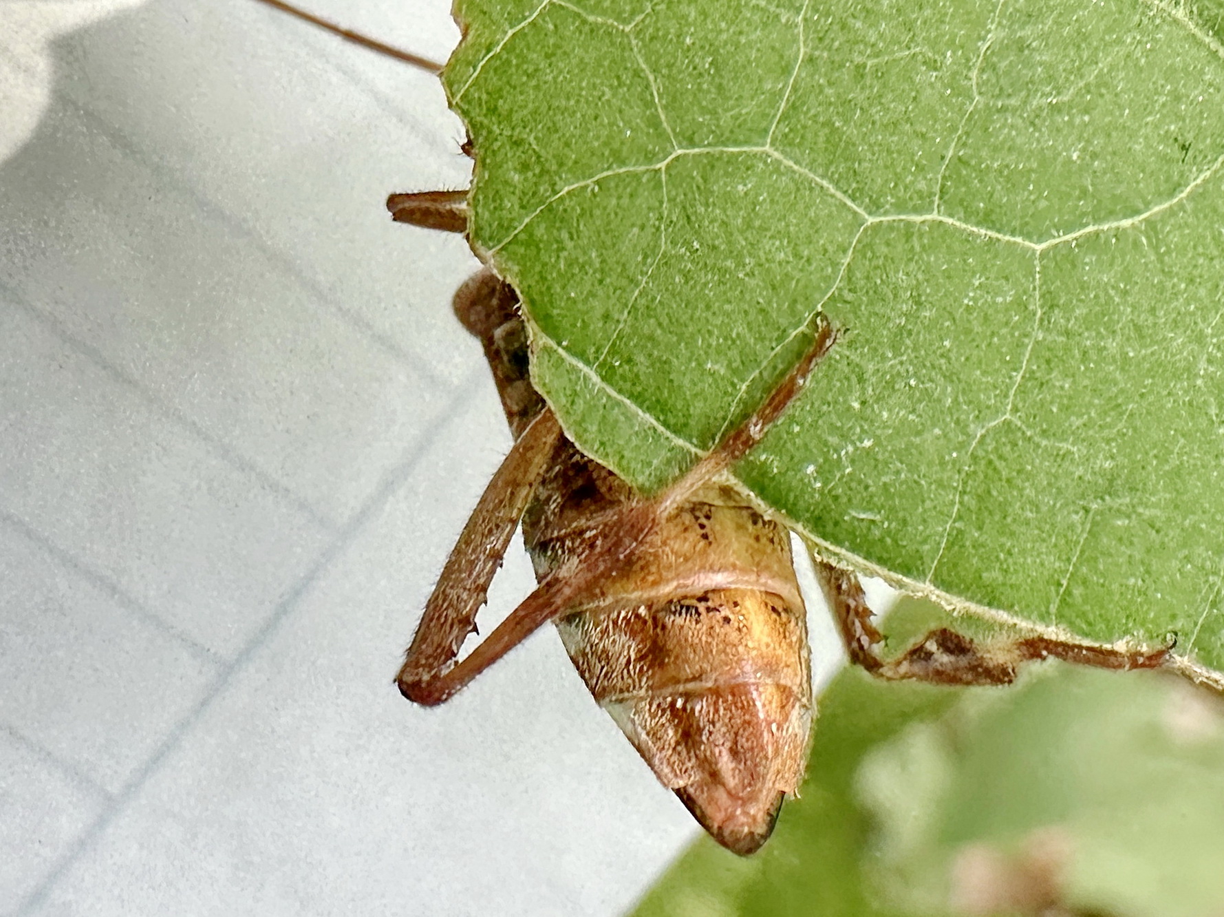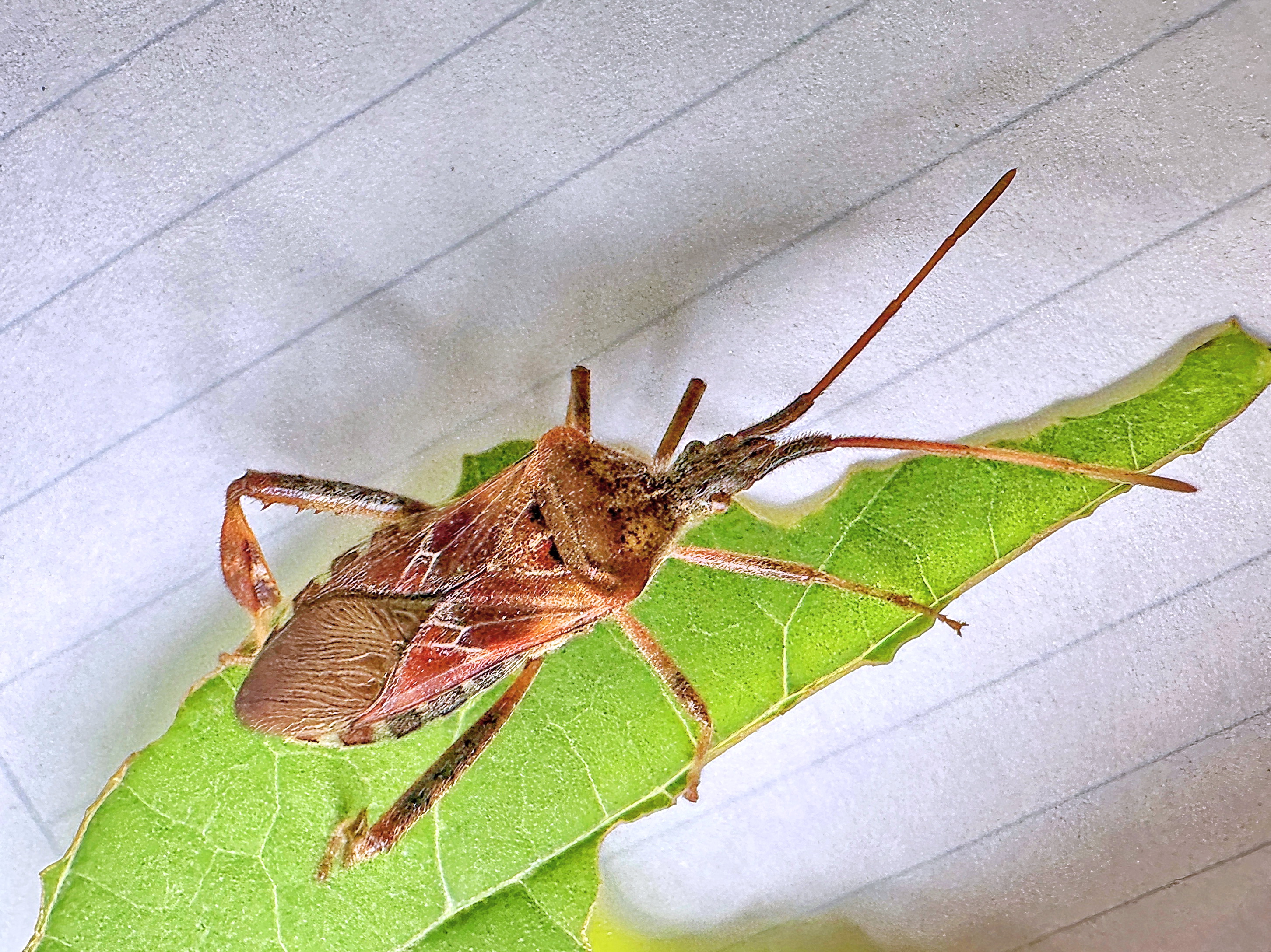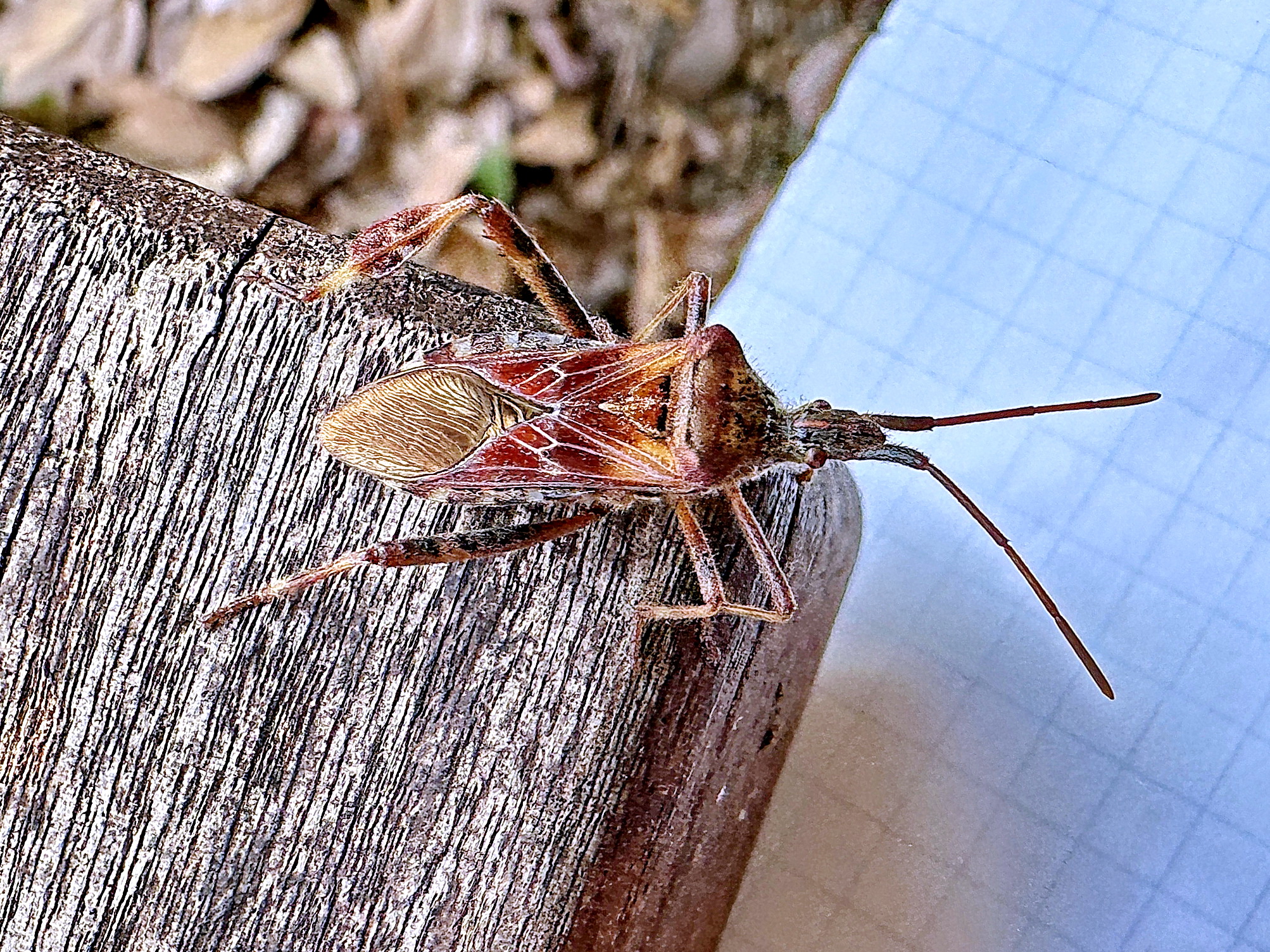 お日様が気持ちいい午後、ベランダの手すりにじっとしているマツヘリカメムシを見つけました。