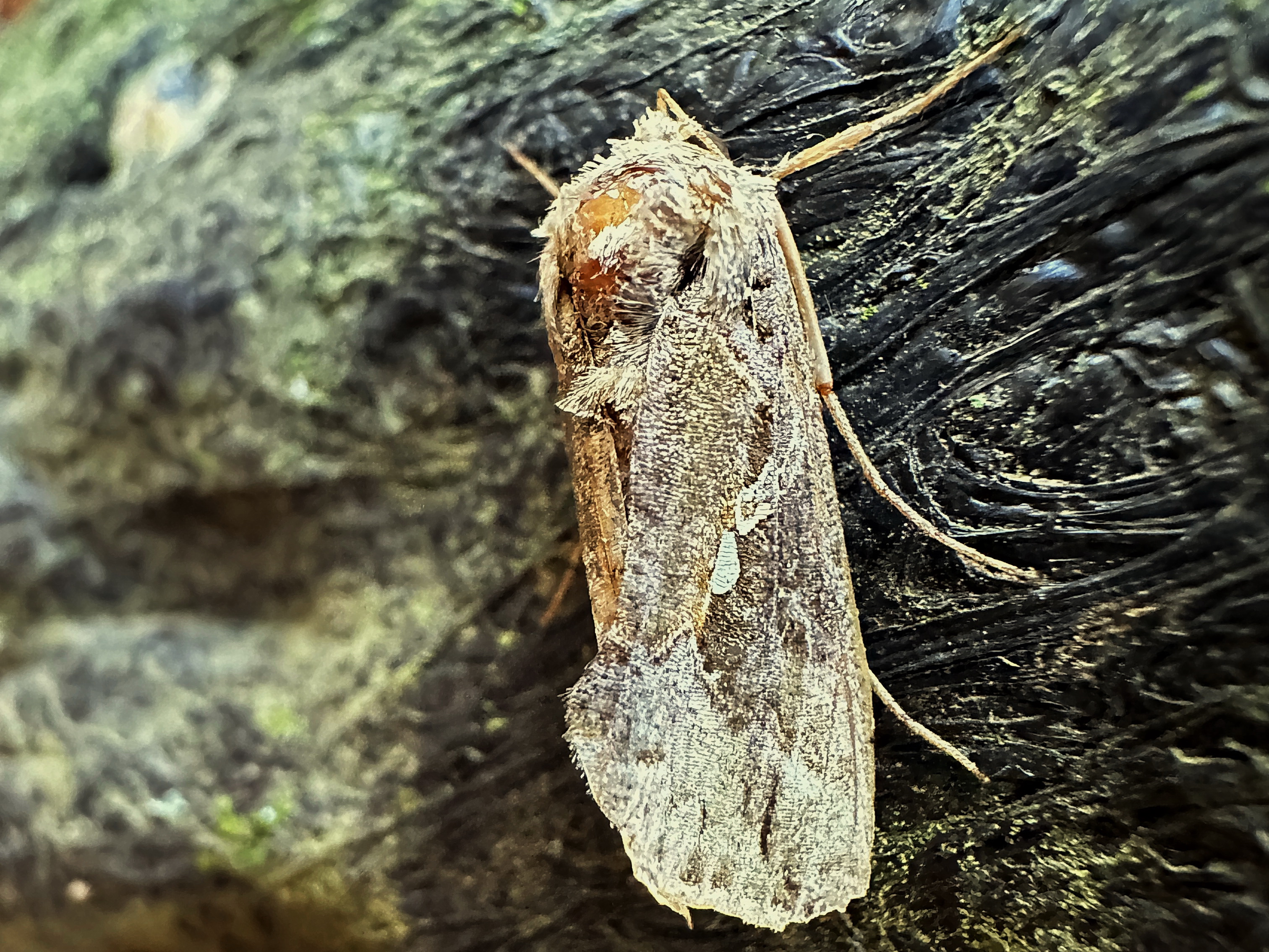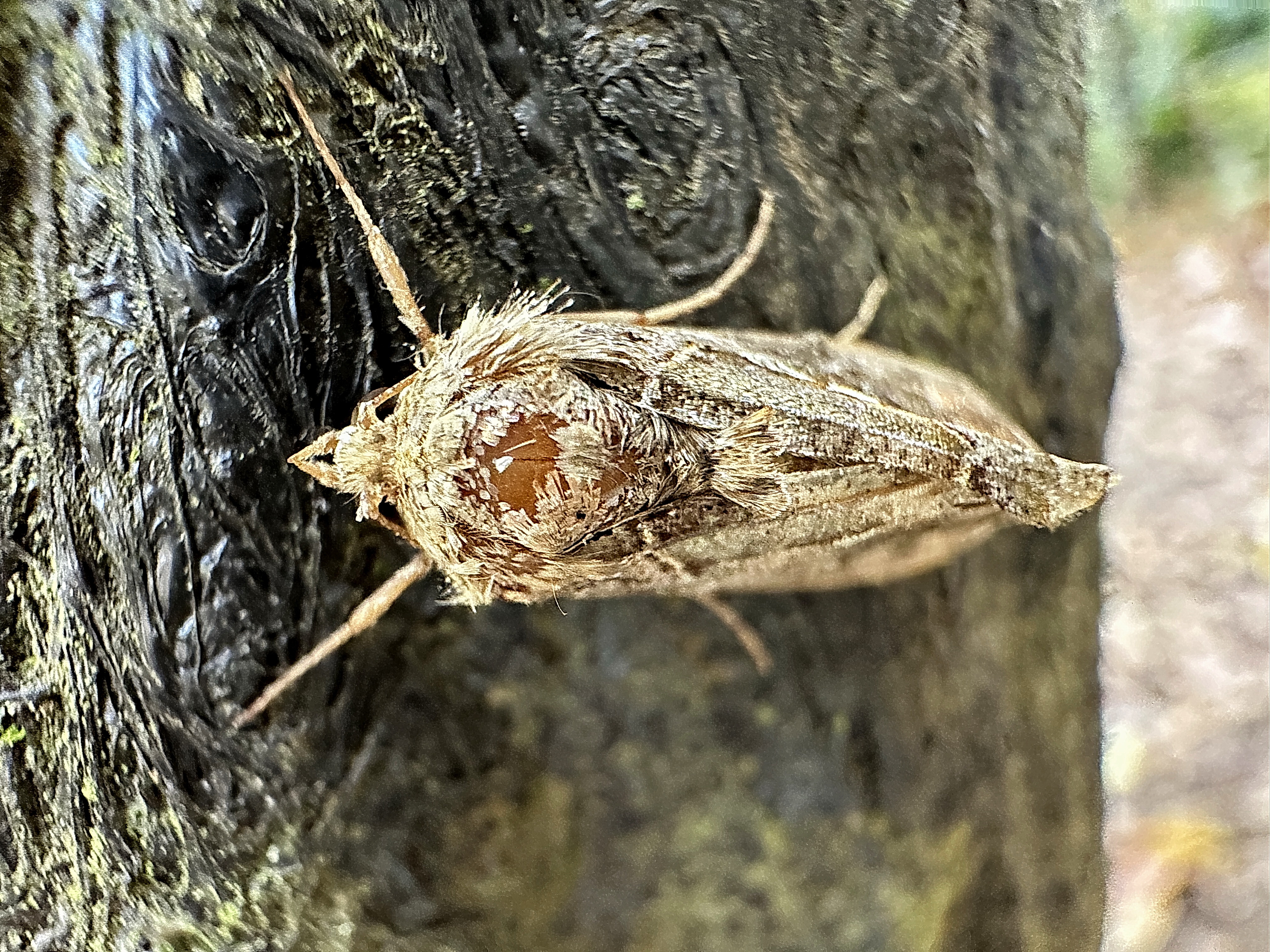 翅の一部も背中の毛束も失われています。白紋とU字紋が発達しています。外横線は後縁付近でV字型に深く曲がります。よく似たイチジクキンウワバは白紋がU字紋より大きく外横線は浅く曲がります。