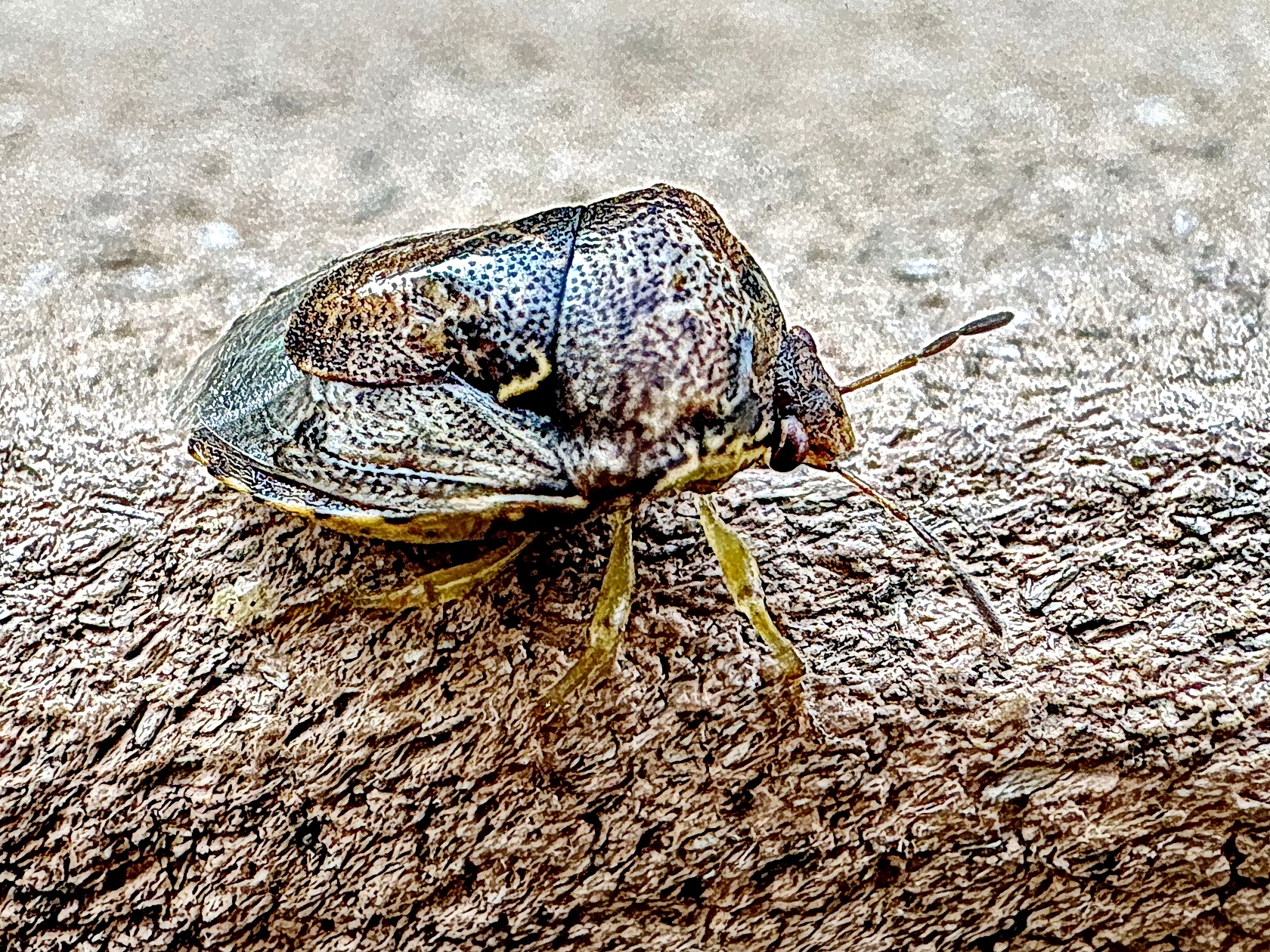 ミヤマカメムシは、山地性のカメムシで、別名 ミヤママダラカメムシ。ミヤマカメムシの腹面には両側に暗色の縦帯が入るそうです。また小楯板は中央が狭まり、前縁角に小さな白い斑紋が入るそうです。