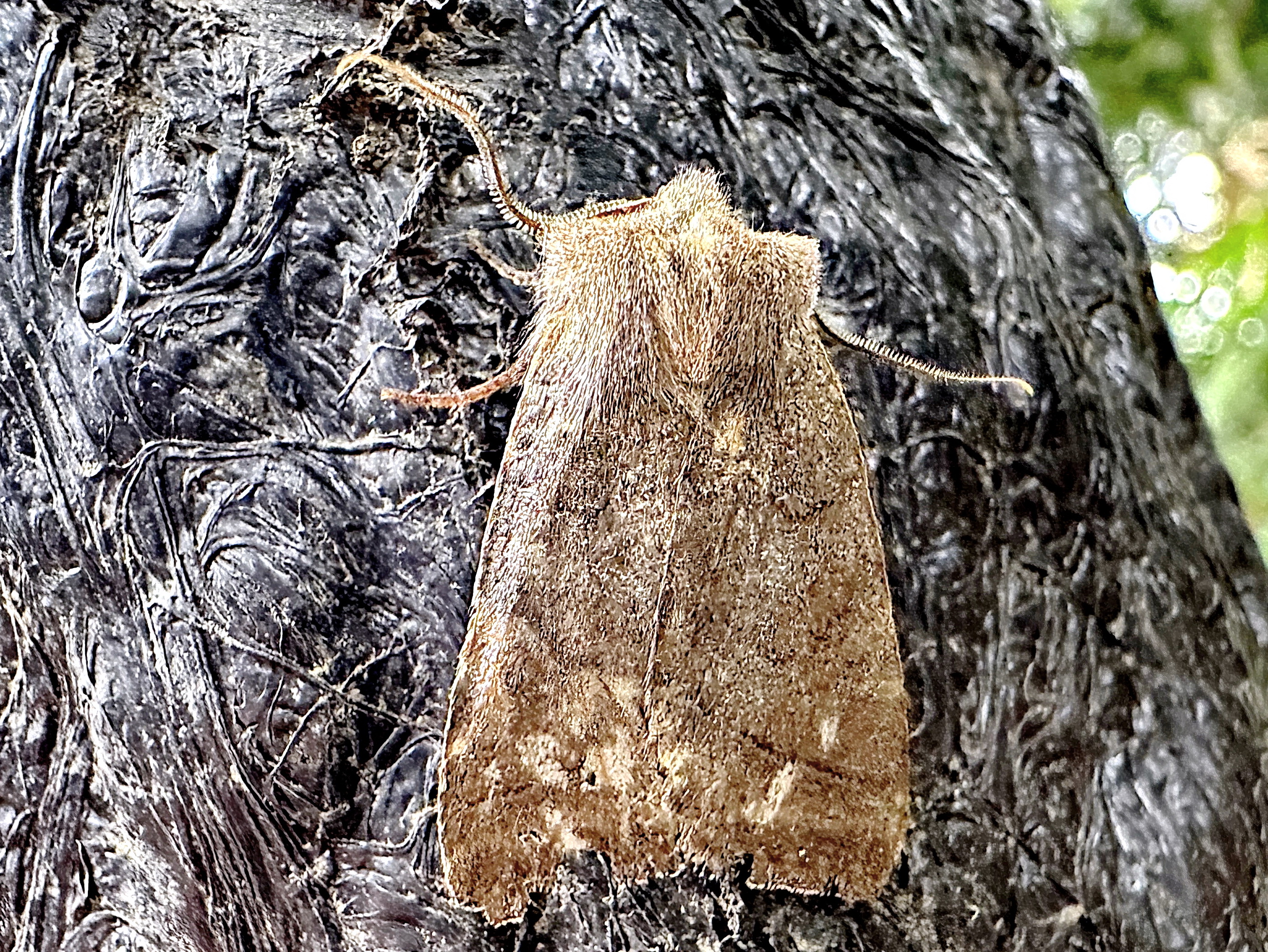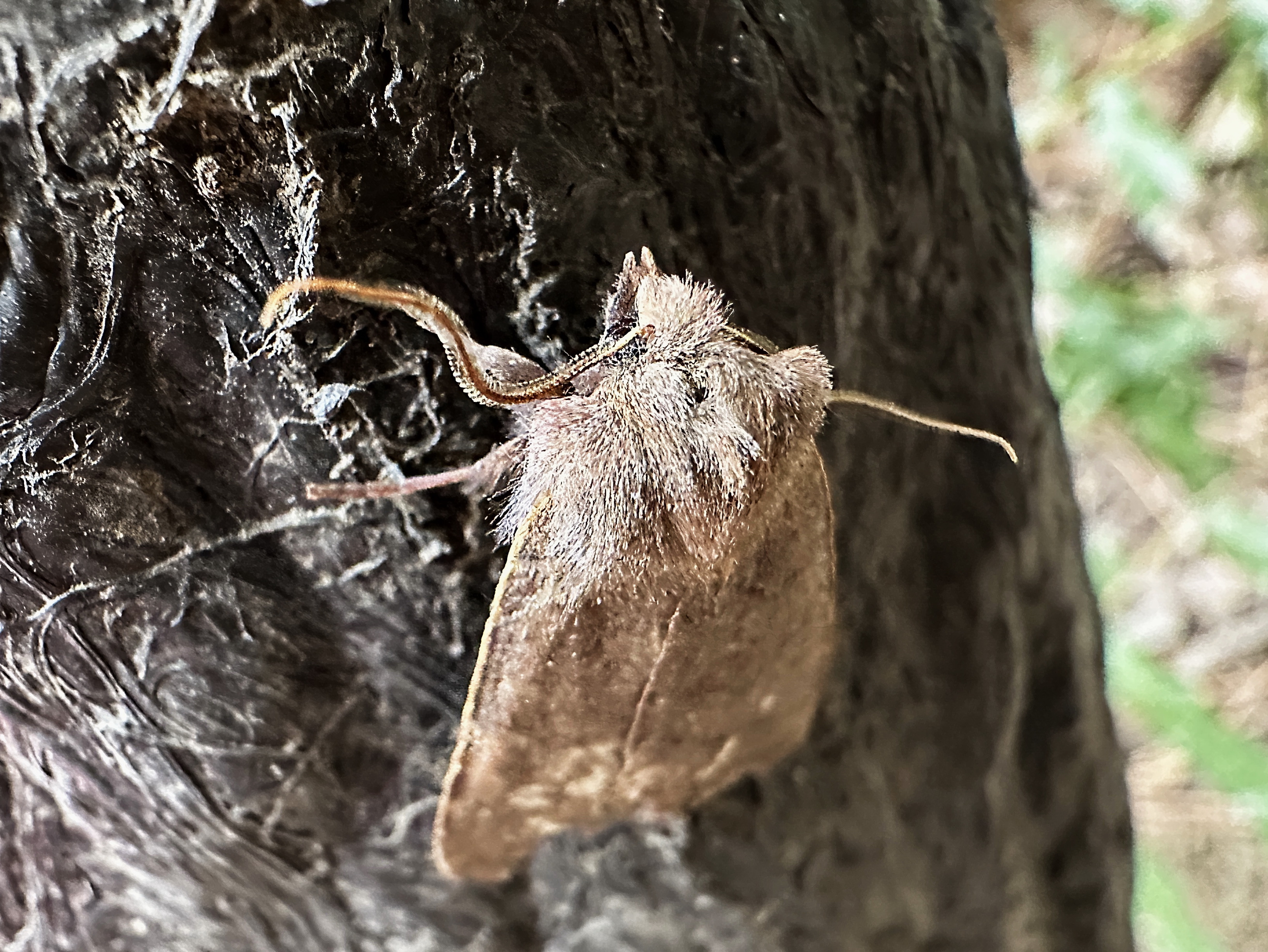柴褐色のキリガ、翅が痛んでいます。前翅は細長く、翅頂が角張っています。外横線が直線的です。胸部肩部の毛が発達していて張り出しています。触角はオスは櫛歯状、メスは糸状。