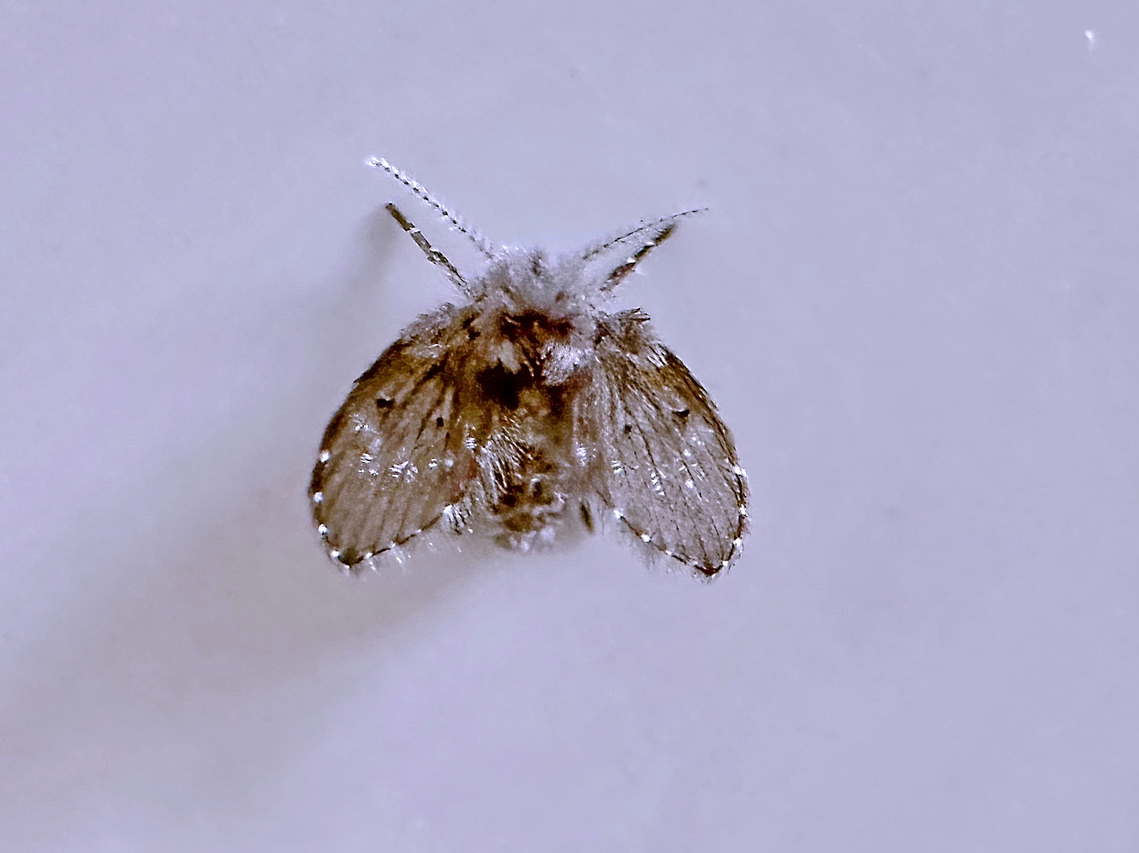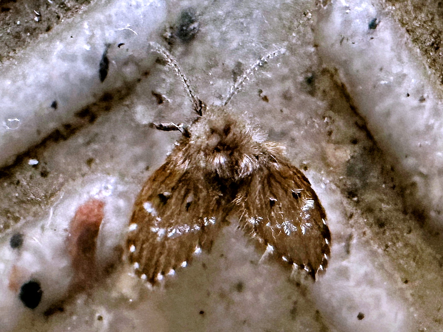 全体が灰褐色、剛毛や鱗網に覆われて毛深い。触角は16環節。翅には黒点が2個、翅縁に8個の白い斑紋が入ります。翅縁には灰白色の毛が生えています。