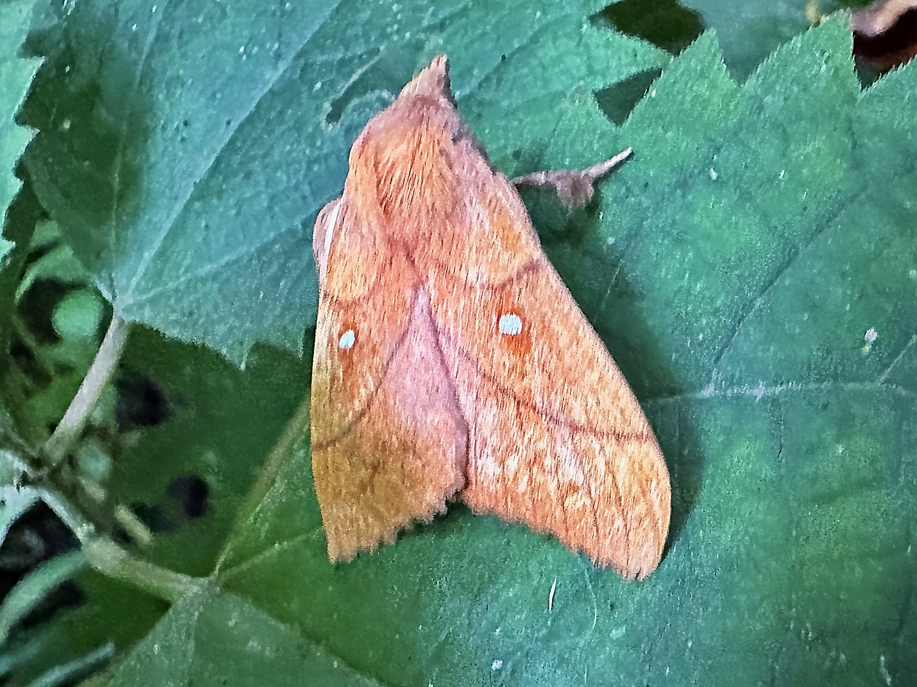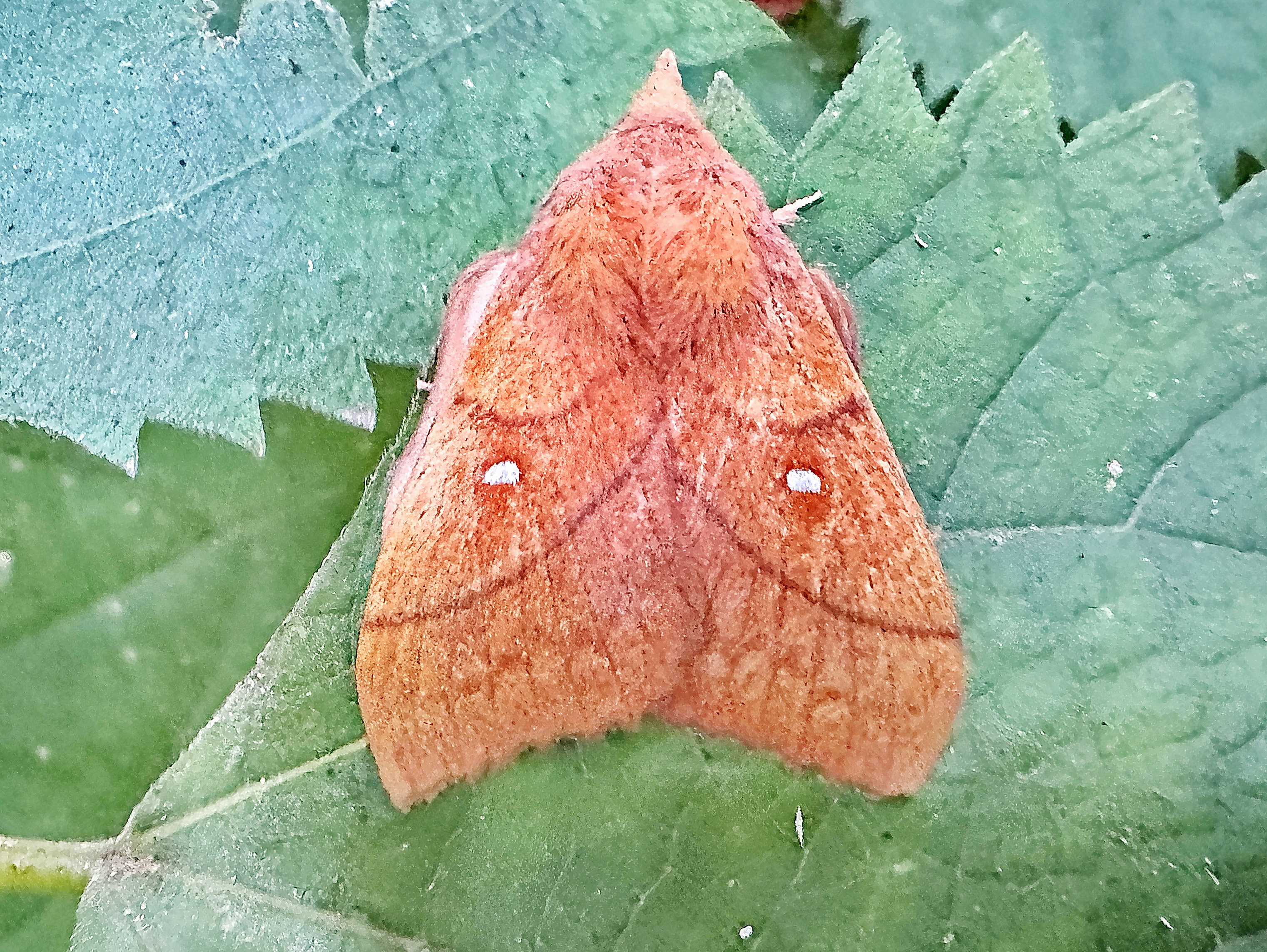 赤褐色に茶褐色の内横線と外横線、その間に明確な白点が入ります。外横線はなだらかな曲線、亜外線は波打ちます。オスの触角は櫛歯状、メスは糸状。後翅が前翅の横にはみ出しています。