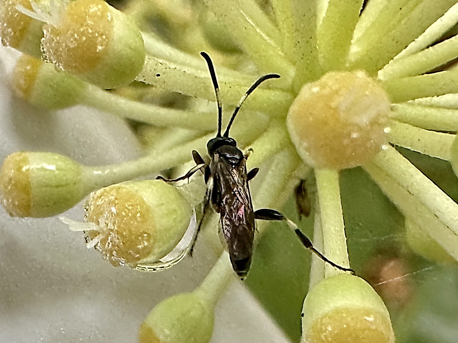 ヤツデで見つけたヒメバチ。全身黒色、触角は黒色でやや太く、中央に白紋が入ります。脚は黒色、前脚、中脚の脛節外側が白色で、後脚脛節基部に白紋が見られます。詳しいことは不明。