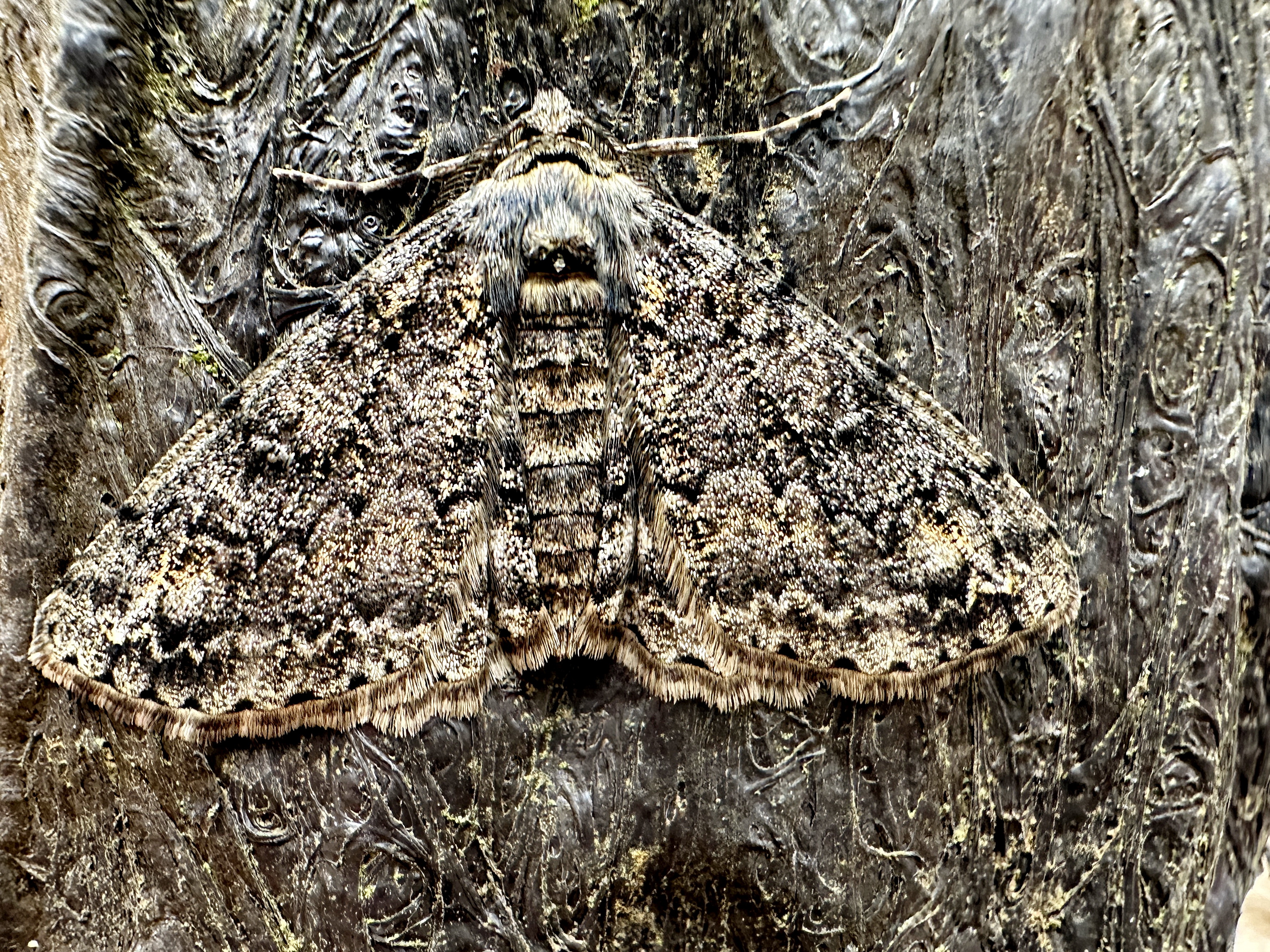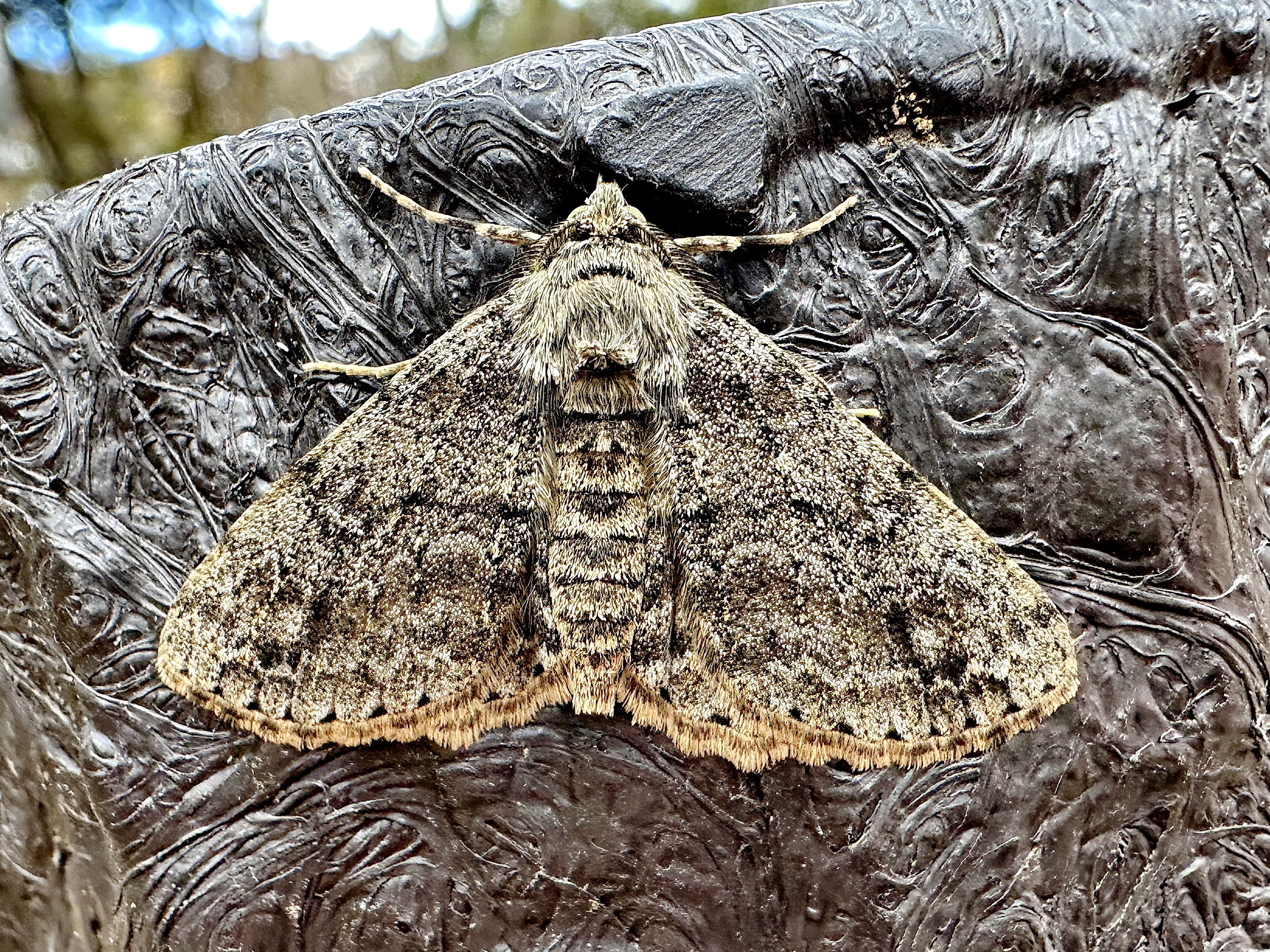春早くに現れるシャクガです。変異が大きく、同じ種とは思えないものもいます。前翅は暗灰色、前翅外横線の外側に白色紋があるのが特徴ですが、目立たない個体もいます。内横線の内側が暗色を帯びています。鋸歯状の外横線は湾曲し、前縁の方が低く中央が高くなります。亜外縁線は白色で波型、後翅外縁は波状です。