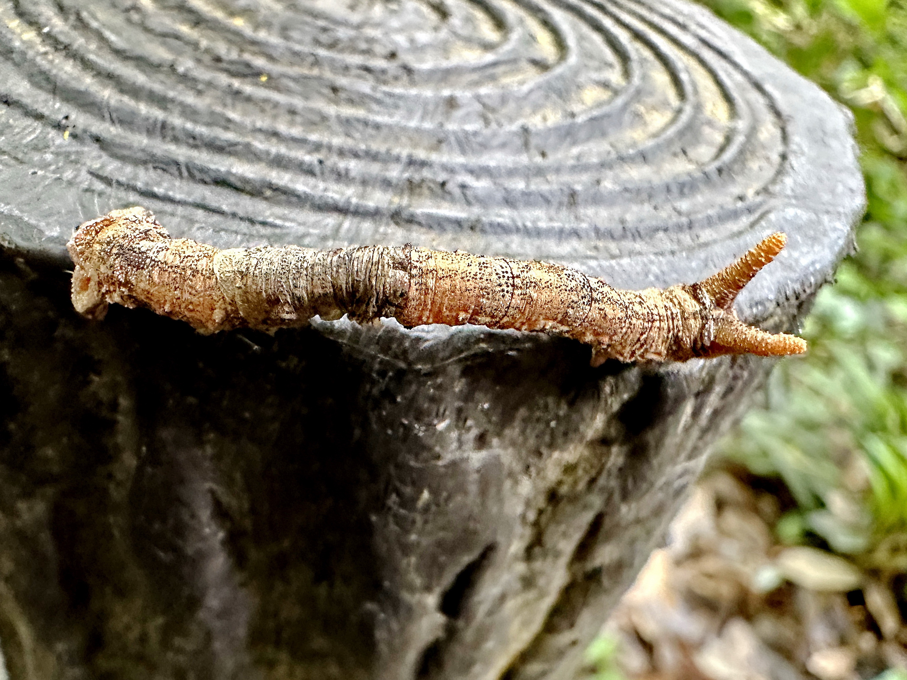 体色は灰色から暗褐色、長さ75~90cmの大きな尺取虫。頭頂が角状に突出してV字型になっています。歩脚は3対、尾脚が2対、尾脚で固定して真っ直ぐに静止して擬態します。視覚上の擬態は勿論ですが、科学的な擬態をしています。幼虫の体表のワックスの成分は食餌植物の樹皮ワックスと成分がよく似ているそうで、アリは植物と区別が出来ないとか。匂いまで纏うという徹底ぶり。
