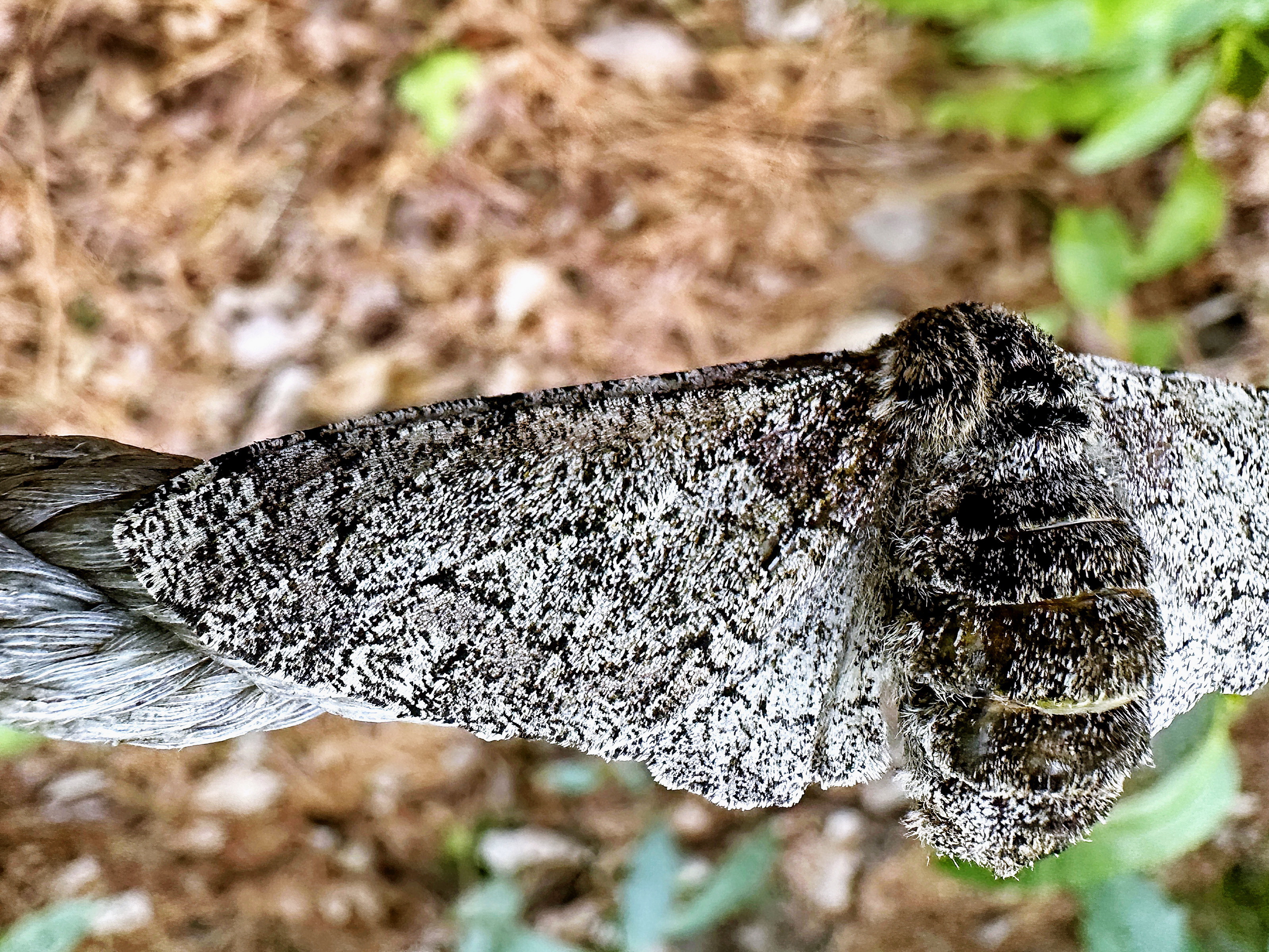 灰色、灰褐色、褐色に黒色の波状の斑紋が入ります。色彩変異が多く、雌は雄より色が薄く、波状の斑紋も不明瞭なものもあります。外横線と中横線の間が白っぽくなりますが、これも変異が多く、ならない個体もあります。雌の方が雄より大型です。腹部は太く、翅は水平より少し下げて止まります。樹木にカムフラージュして、色彩も斑紋も溶け込むように、頭部をうずめて、触角を隠して斜めにべったりとくっ付いて止まります。白い背景でも止まるのは斜めなんですね。