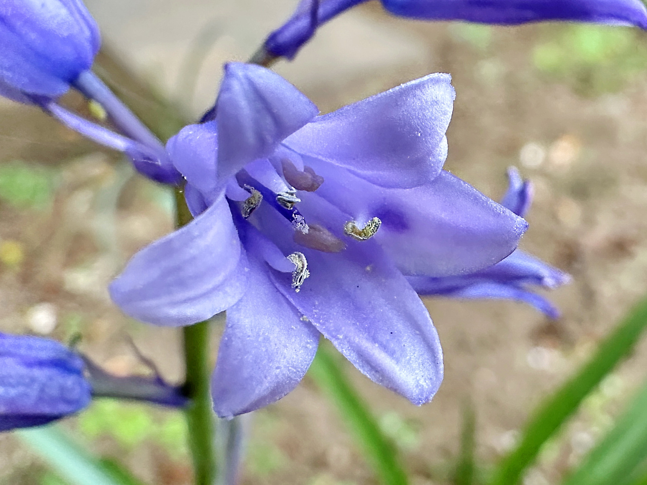 濃色の筋が入った鮮やかな青色の花です。花色は青紫色の他、白、赤、ピンク、緑、混色など。茎は細く、放射状に小花を沢山付けます。花弁は6枚、雄しべ6本、柱頭は3裂します。