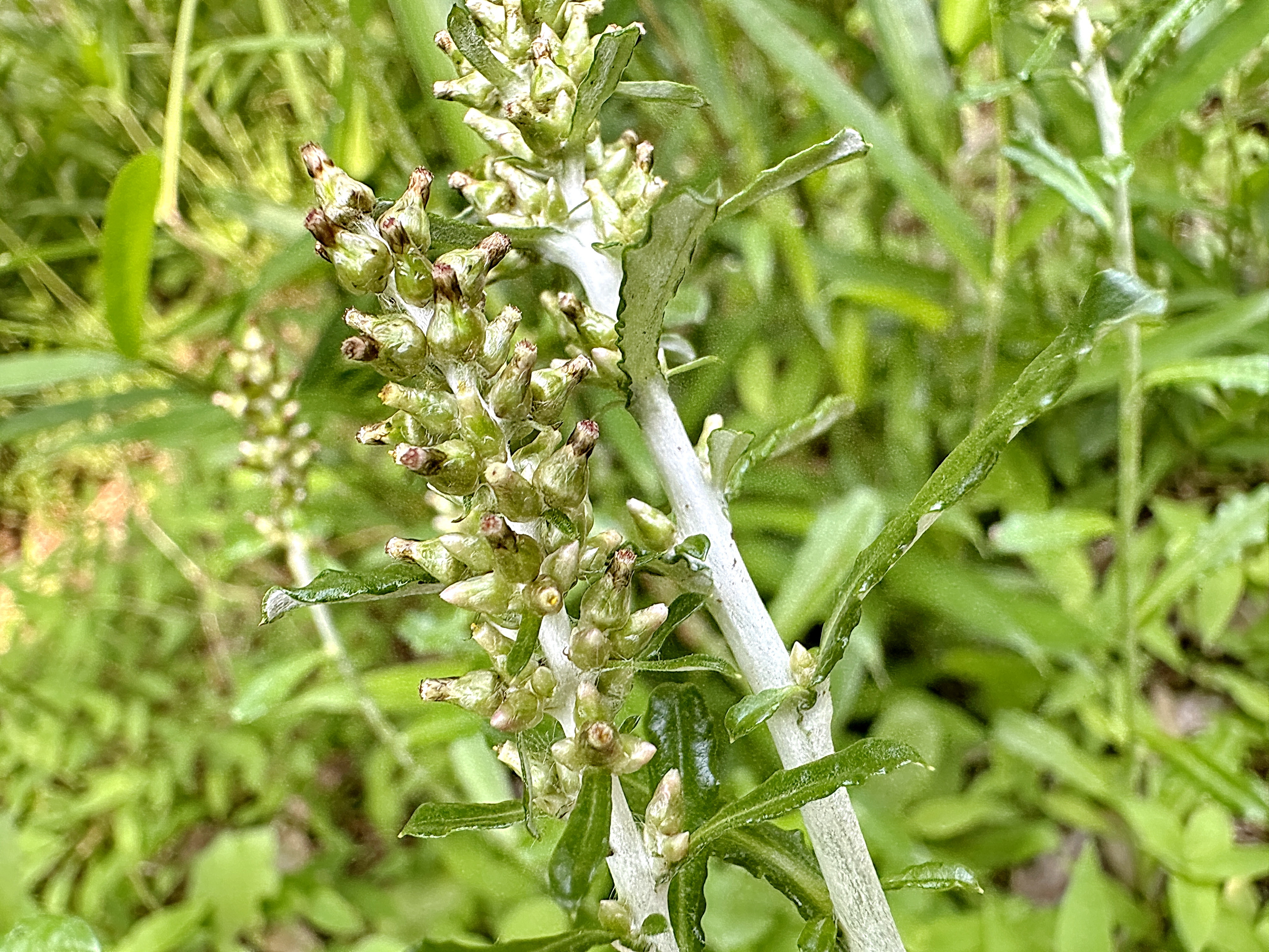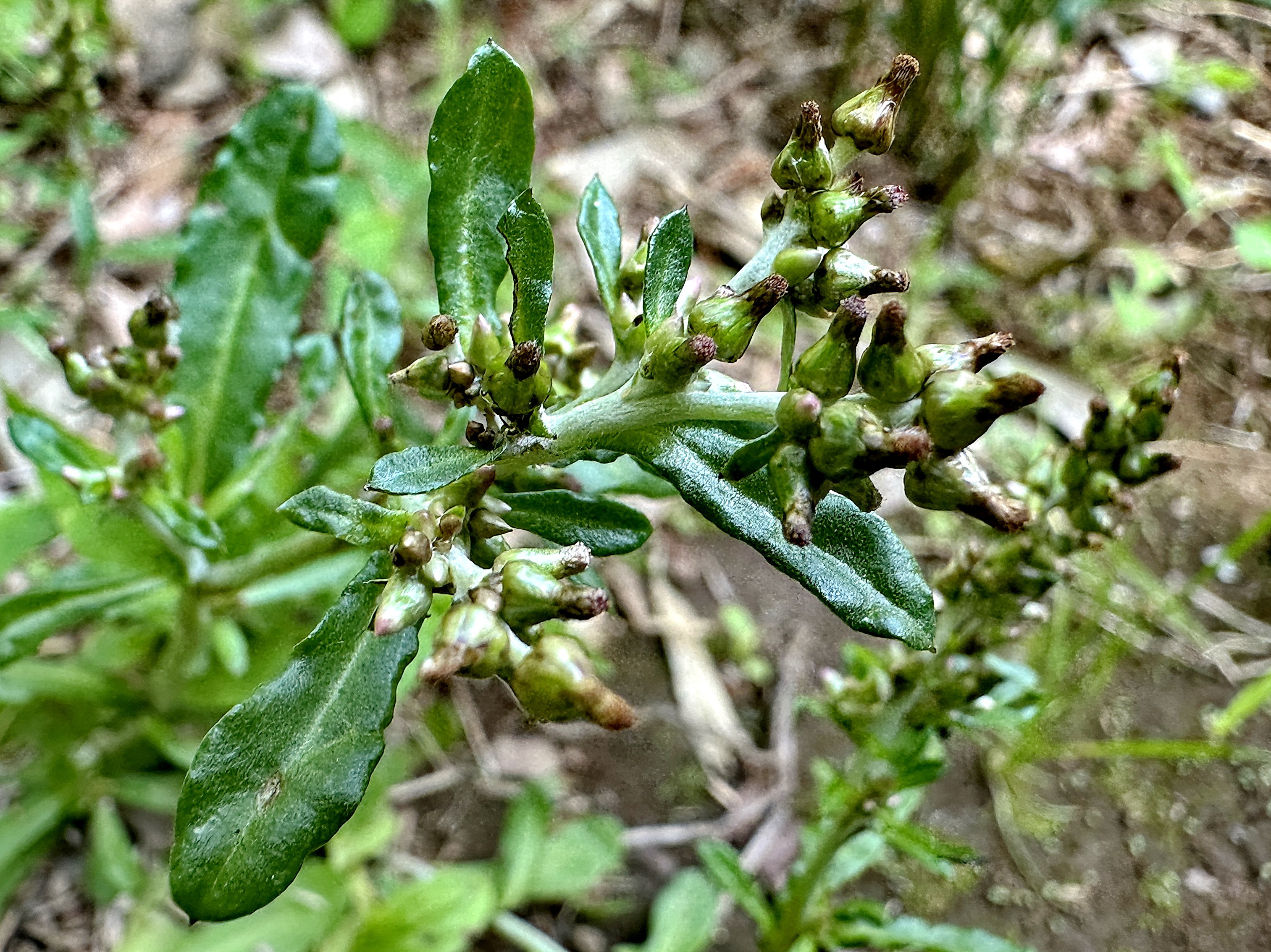 花期にも根生葉が残ります。頭状花は茎の上部に集まり直径4mmのつぼ型の管状花です。数個の両性花とその周りに雌花を沢山付けます。総苞片は4~5枚で毛がなく光沢のある黄緑色です。