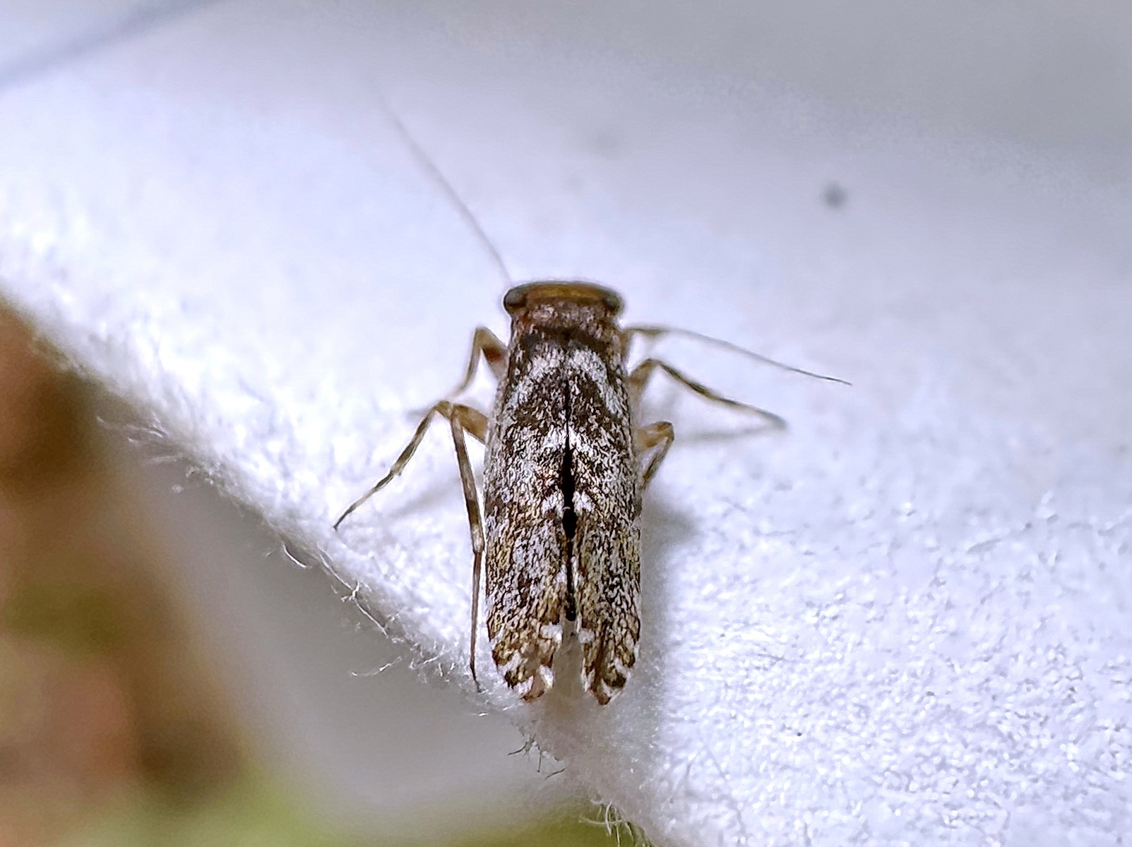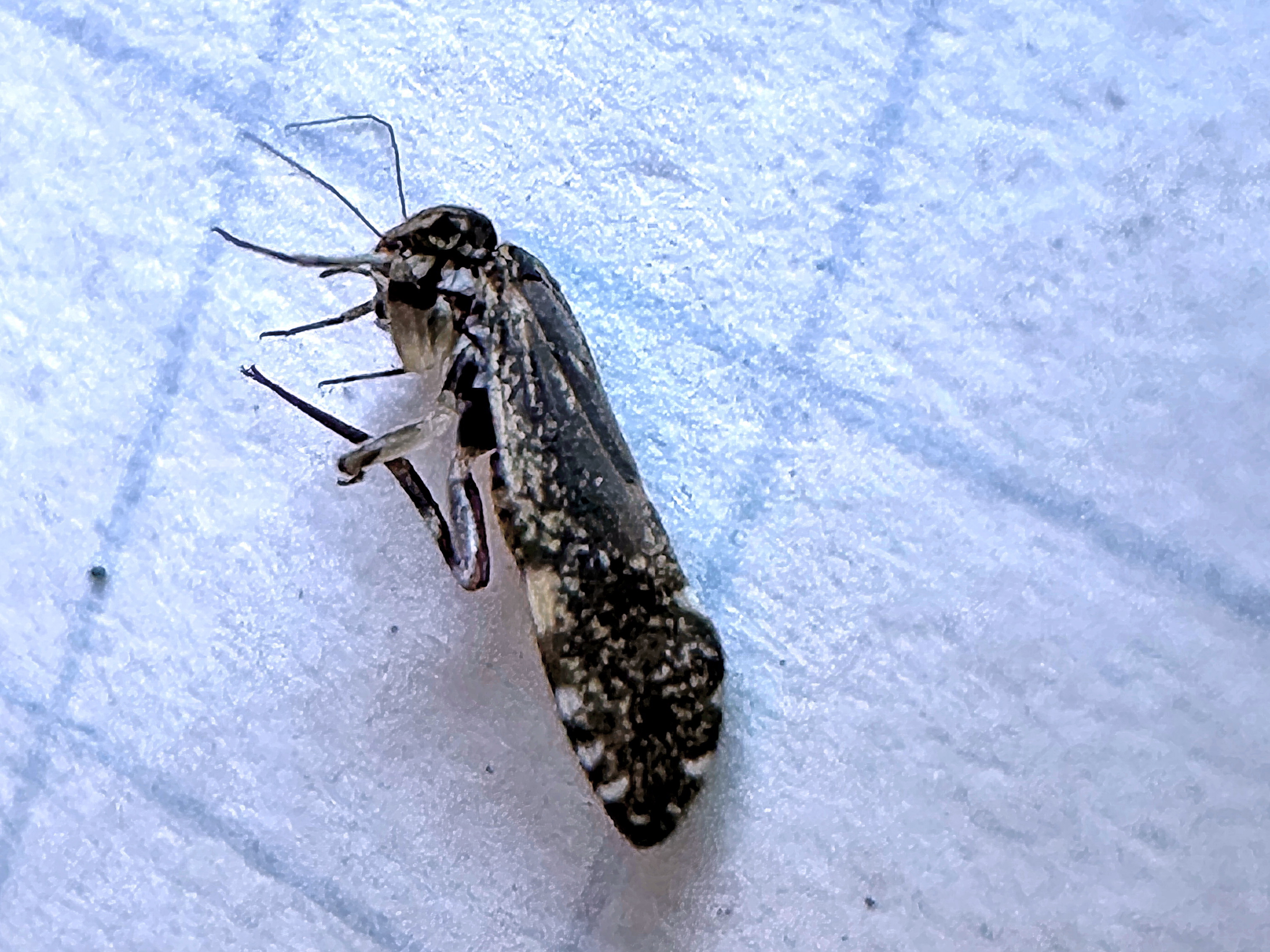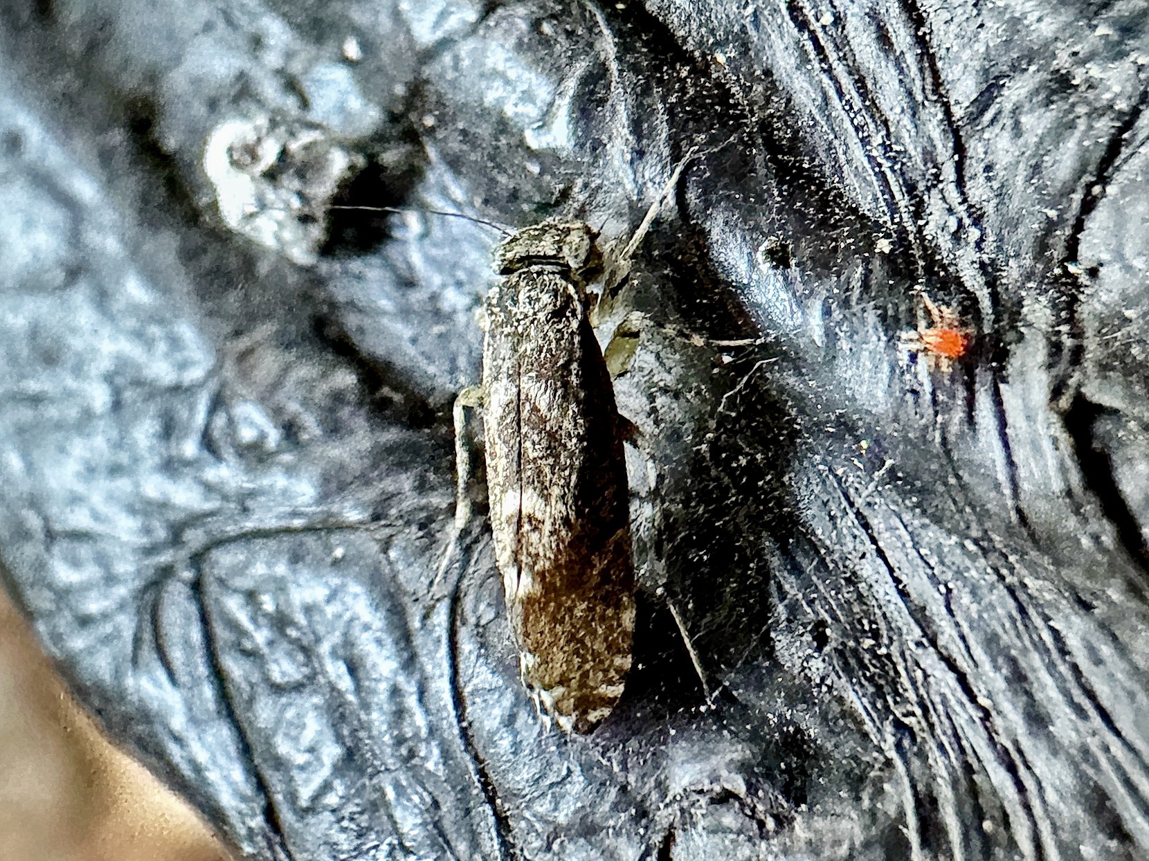 チャタテムシは透明の翅に斑紋が入ることが多いですが、ウロコチャタテは上翅が鱗片や鱗粉に覆われ、暗灰褐色と淡灰褐色の斑紋になっています。
