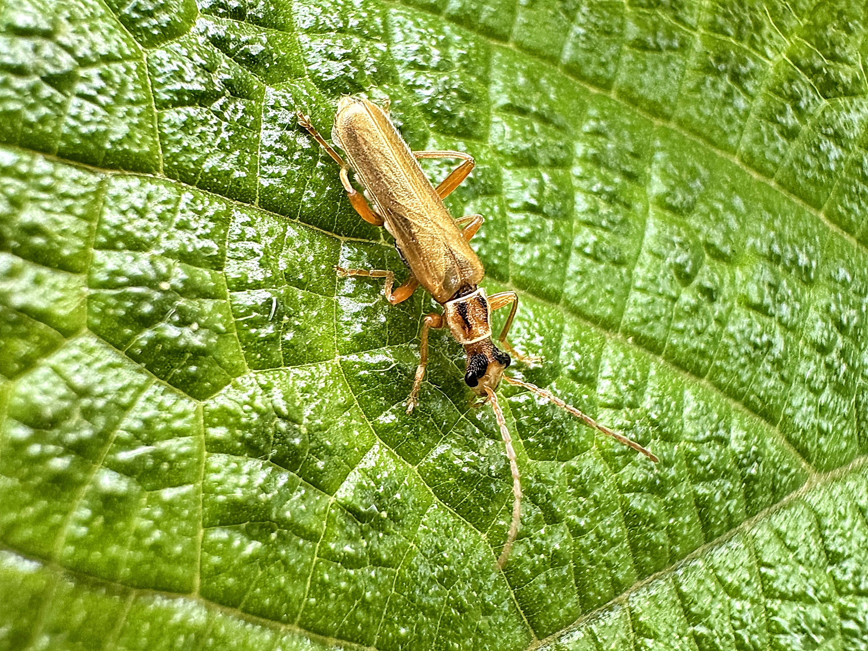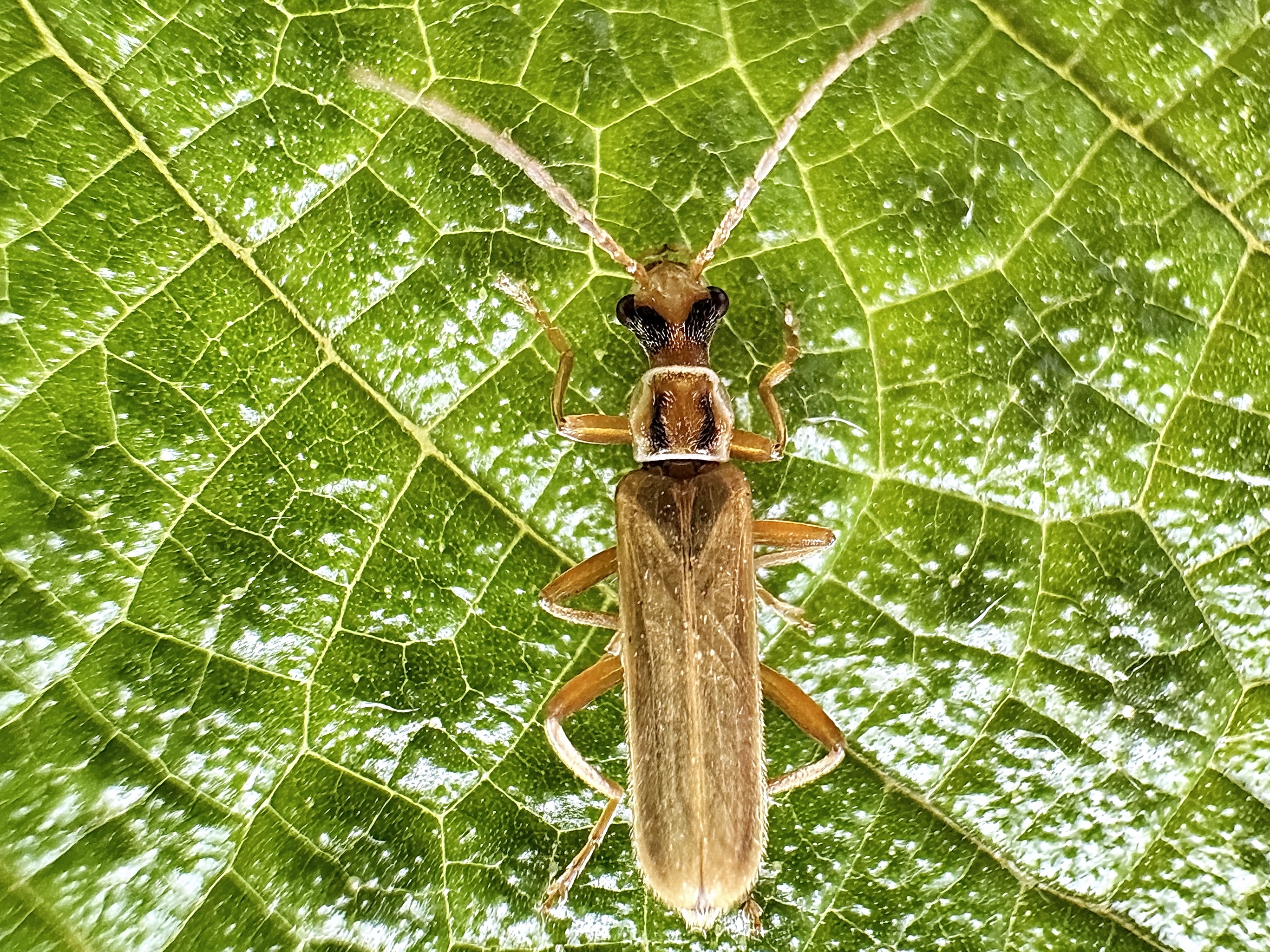 淡褐色のジョウカイボン、雌雄同型で、外見上の区別は困難です。クビボソは頭部より前胸部の方が幅が狭いことから。頭部、前胸背板に1対の黒斑が入ります。