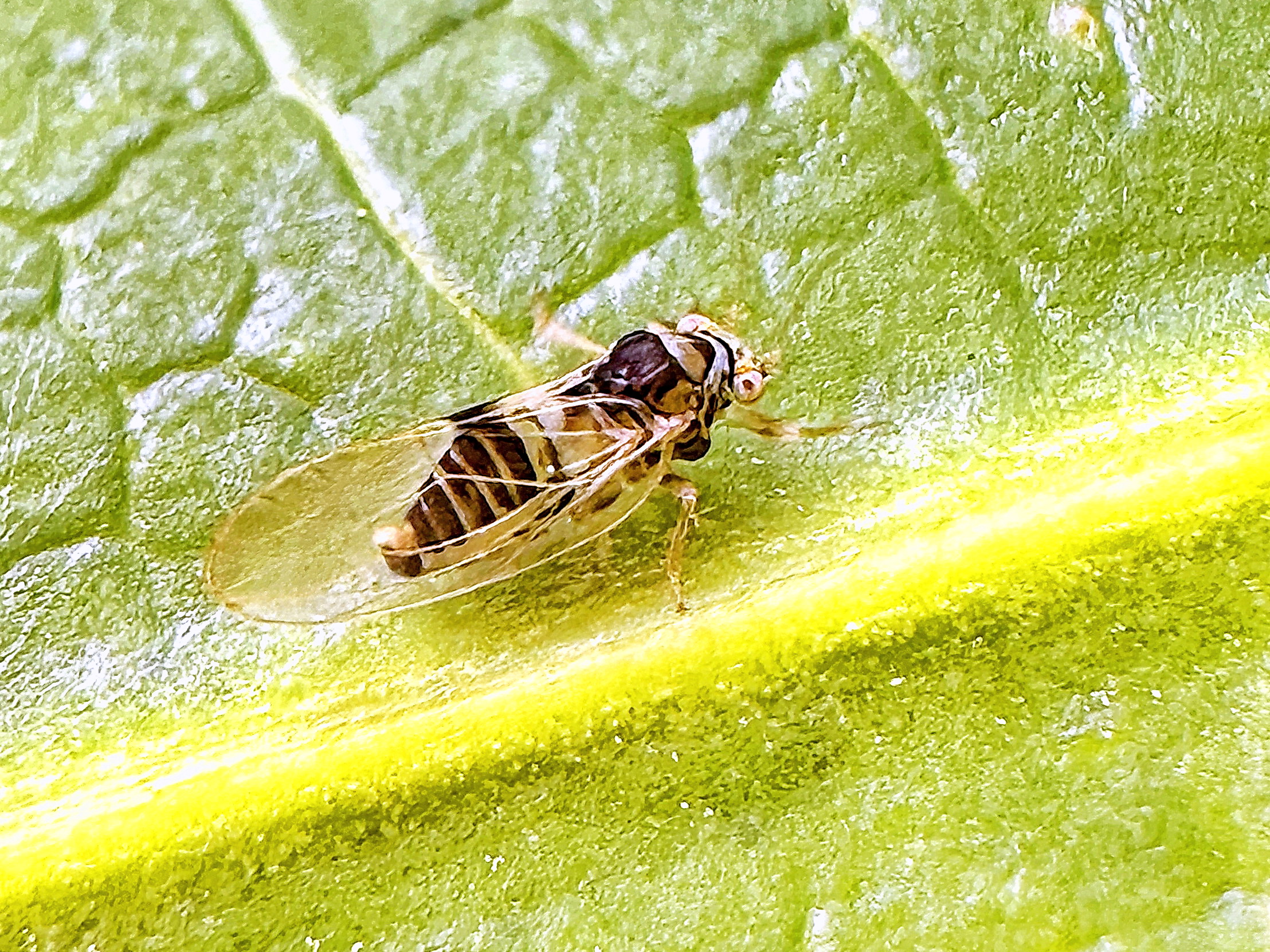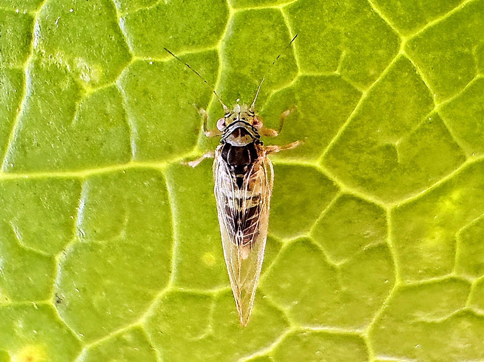 ヤツデの葉表で見つけたキジラミ、羽化したときは全身淡橙色だそうです。半透明の額錐が前下方に突出し、複眼の間に単眼が3個、触角は11節、前翅は透明で後縁中央部に暗褐色の斑紋が入ります。オスとメスでは色が異なり、メスは色が明るく淡橙褐色、オスは色が濃く暗褐色。後脚が発達していてぴょんと飛んで逃げられました。